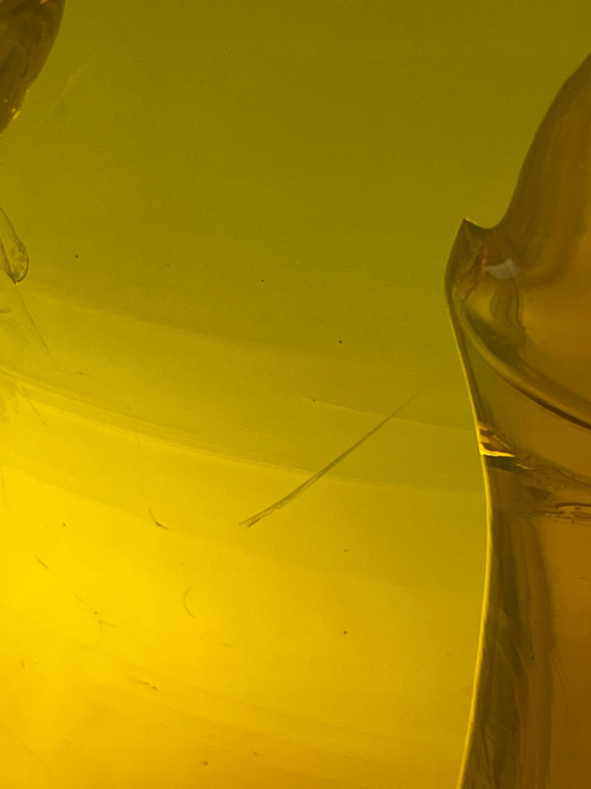 Стан видно на фото, на кухлі помітна тріщина довжиною близько 7 см від краю наповнювача по діагоналі. внизу і на торцях під кріпленням ручки і на поверхні є тільки виробничі дефекти у вигляді нерівностей, через тріщину кружка лише декоративна.