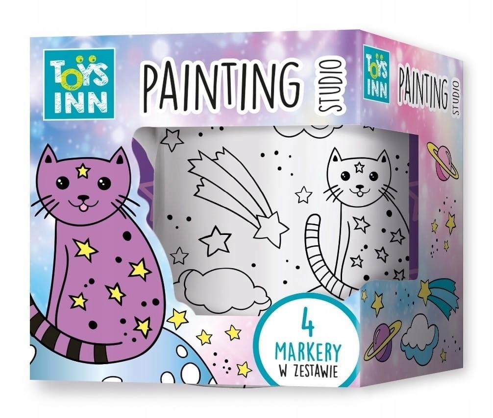 Керамічна кружка-розмальовка — це чудова творча розвага. У набір входять маркери чотирьох кольорів: жовтий, рожевий, синій, фіолетовий. Завдяки їм кожна дитина може оригінально розфарбувати свою кухоль. Все це упаковано в декоративну картонну коробку.