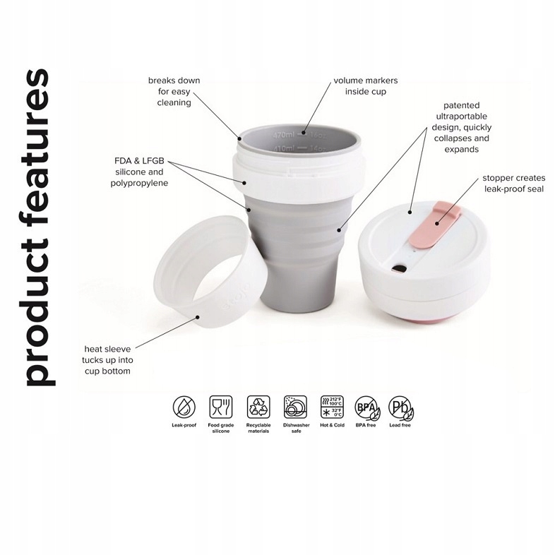 Можливість складання чашки після вживання напою робить її ідеальним супутником шлях до школи, на роботу чи в подальшу дорогу. Кружка Stojo Pocket має 13 см в розкладеному вигляді і всього 5 см в складеному вигляді. Діаметр його кришки 9 см.