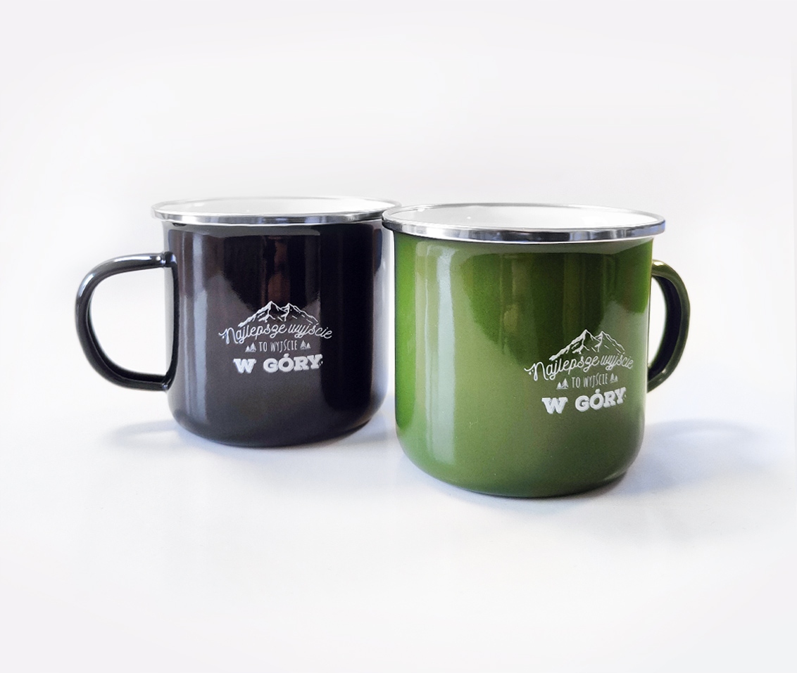 Цього разу для вас сталева, емальована кухоль у вінтажному стилі, чорна, з напис «Найкращий вихід це вихід в гори».