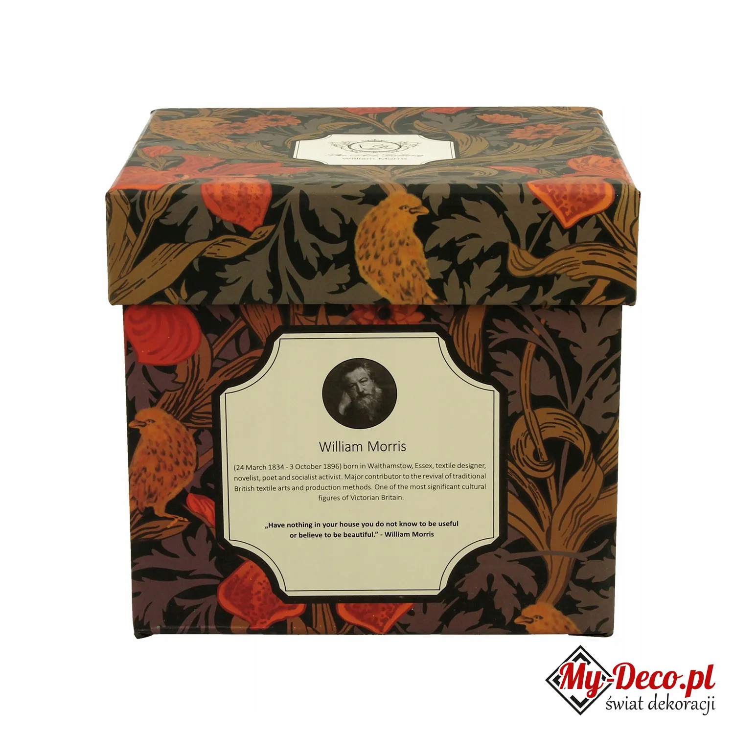 Вільям Морріс був англійським художником, ілюстратором, архітектором, дизайнером, письменником і поетом валлійського походження 19 століття. Він був провідним членом руху мистецтв і ремесел, і його погляд на поєднання мистецтва та промисловості заклав основи для еволюції дизайну. Він активно пропагував радість ремесел і красу природи. Характерні візерунки Морріса, навіяні кружляючими виноградними лозами, квітковими мотивами та химерно переплетеним листям, можна знайти на шпалерах і тканинах, а тепер також і на наших порцелянових виробах, таких як чашки та кухлі, упаковані в привабливу та естетичну подарункову упаковку.