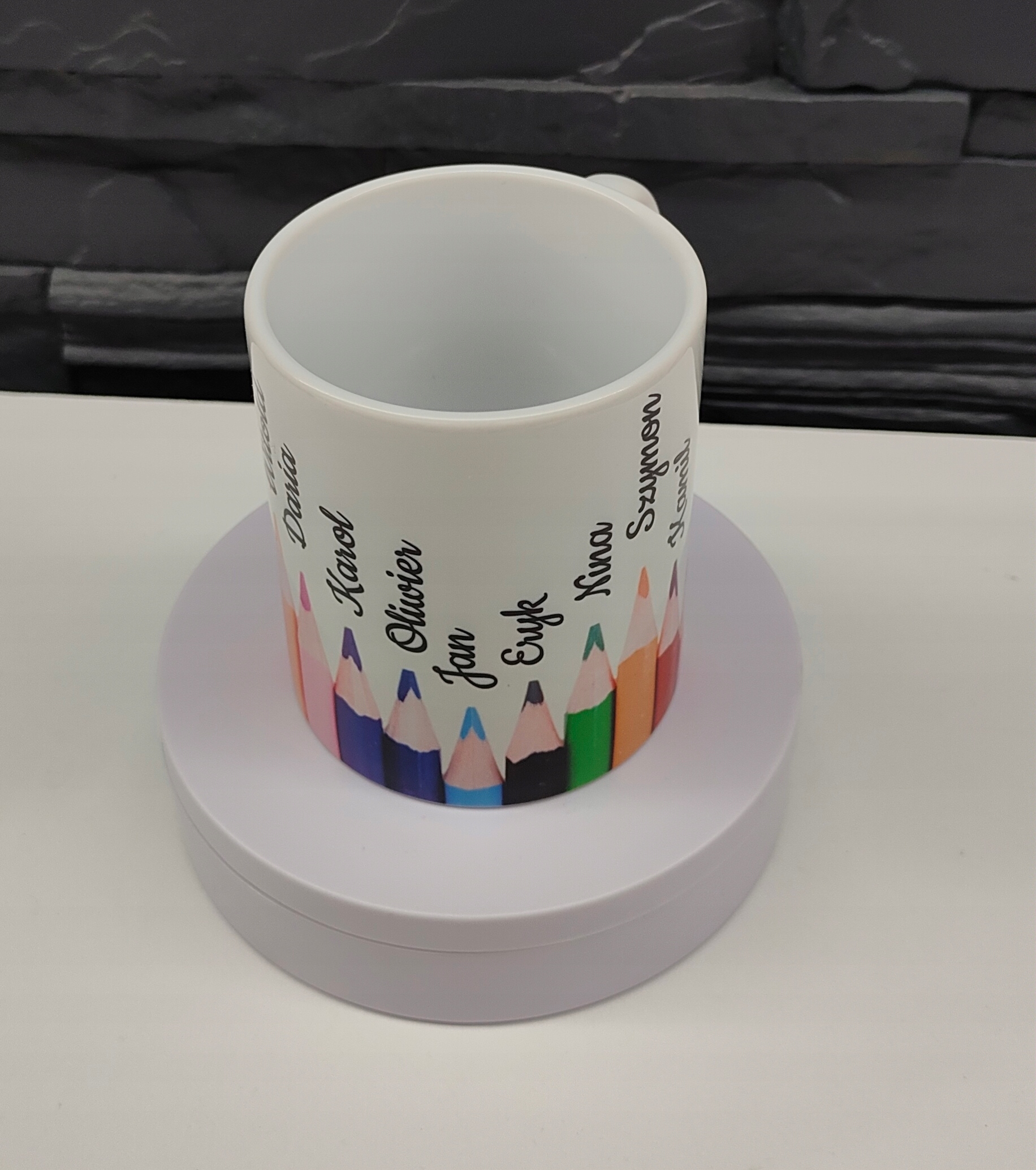 Кухоль надрукована з барвистими олівцями, кожен з яких символізує ім'я однієї дитини в класі. Це створює унікальний і зворушливий сувенір , який залишиться в самому серці вчителя, який приймає його довго.