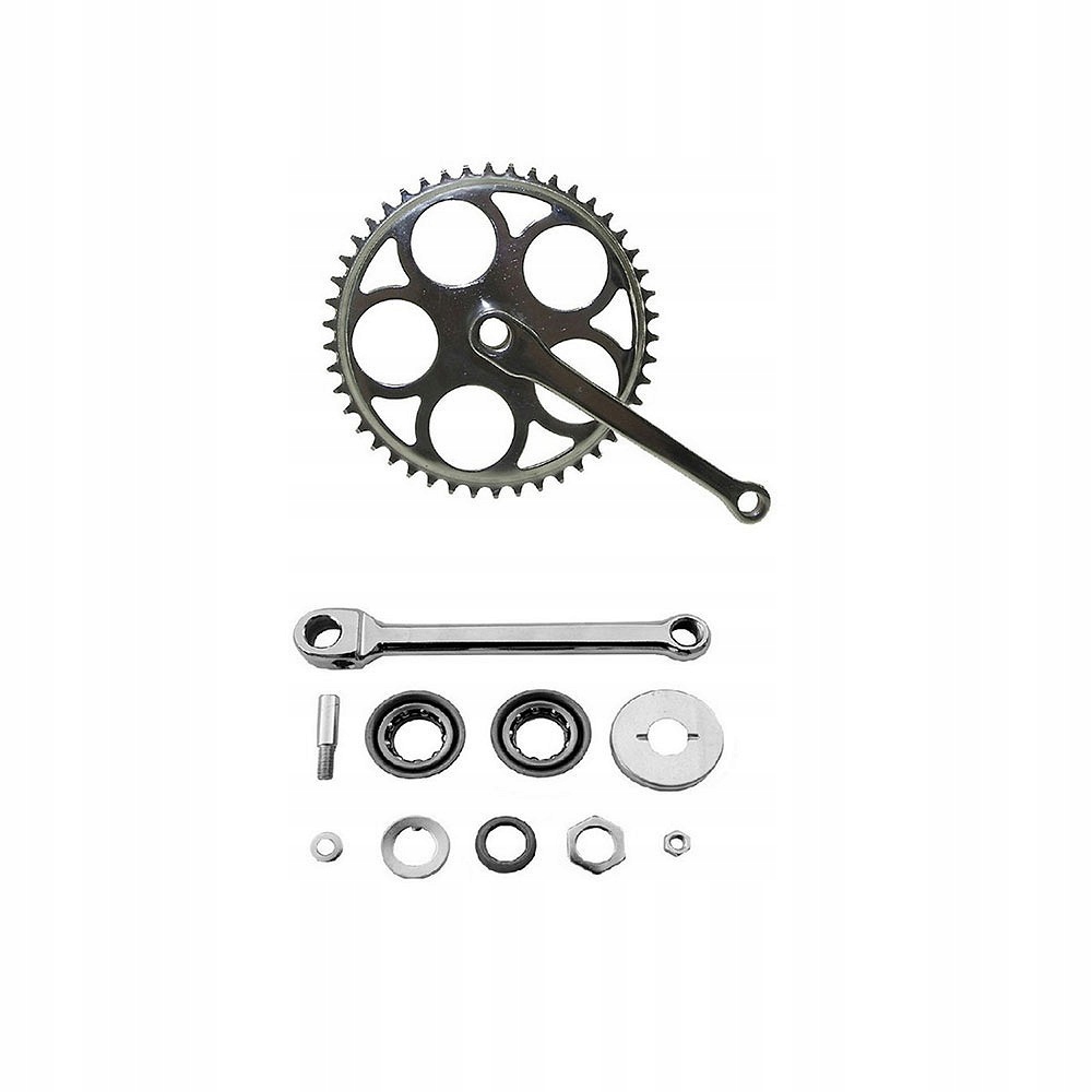 Шивошипно-шатунний механізм WIGRY, однорядний з двома ключами, сталь, 46 зубів, довжина кривошипа 170 мм, вісь в комплекті з чашками (діаметр 40 мм), конуси та шарикопідшипники, колір хром
