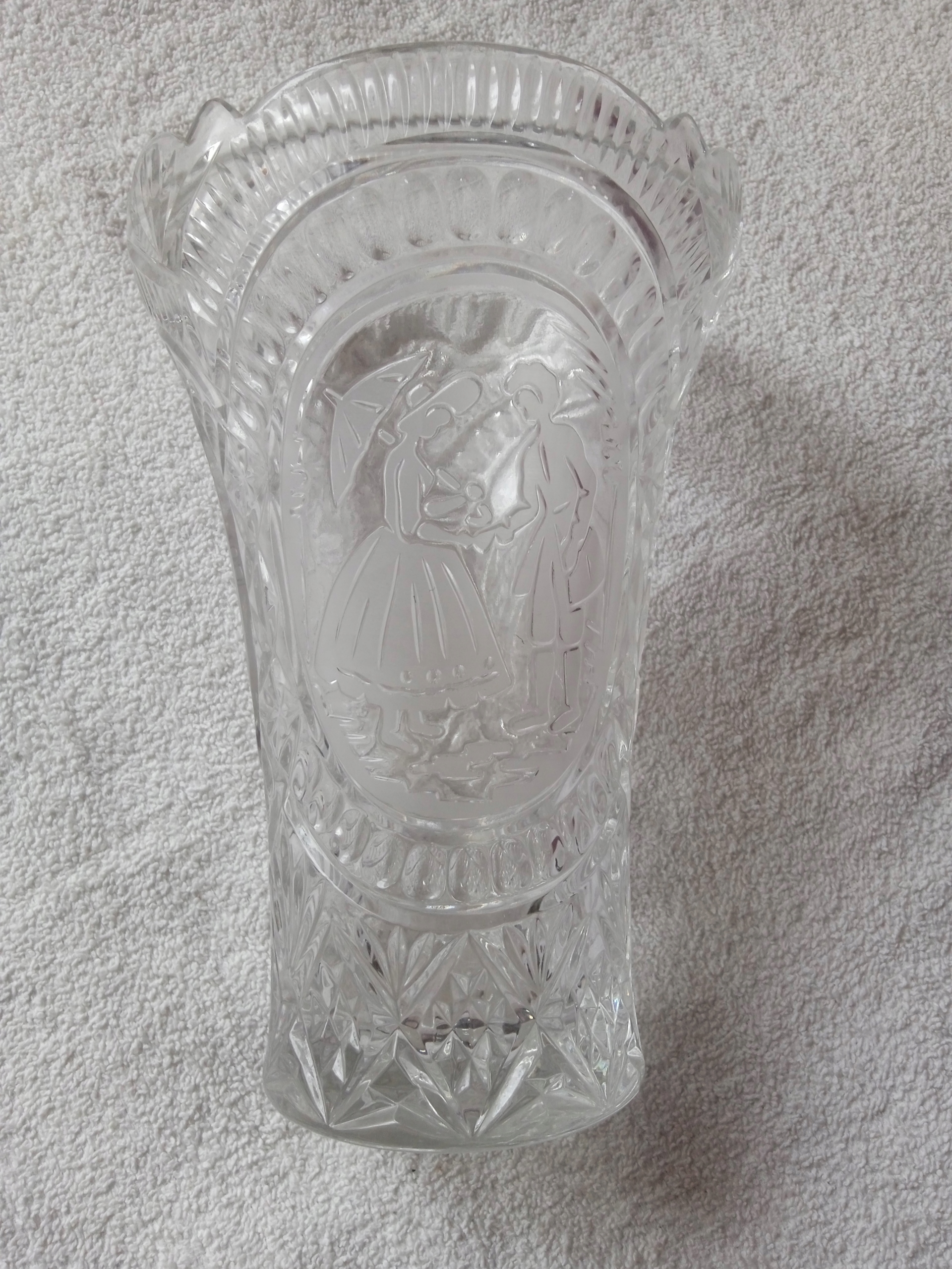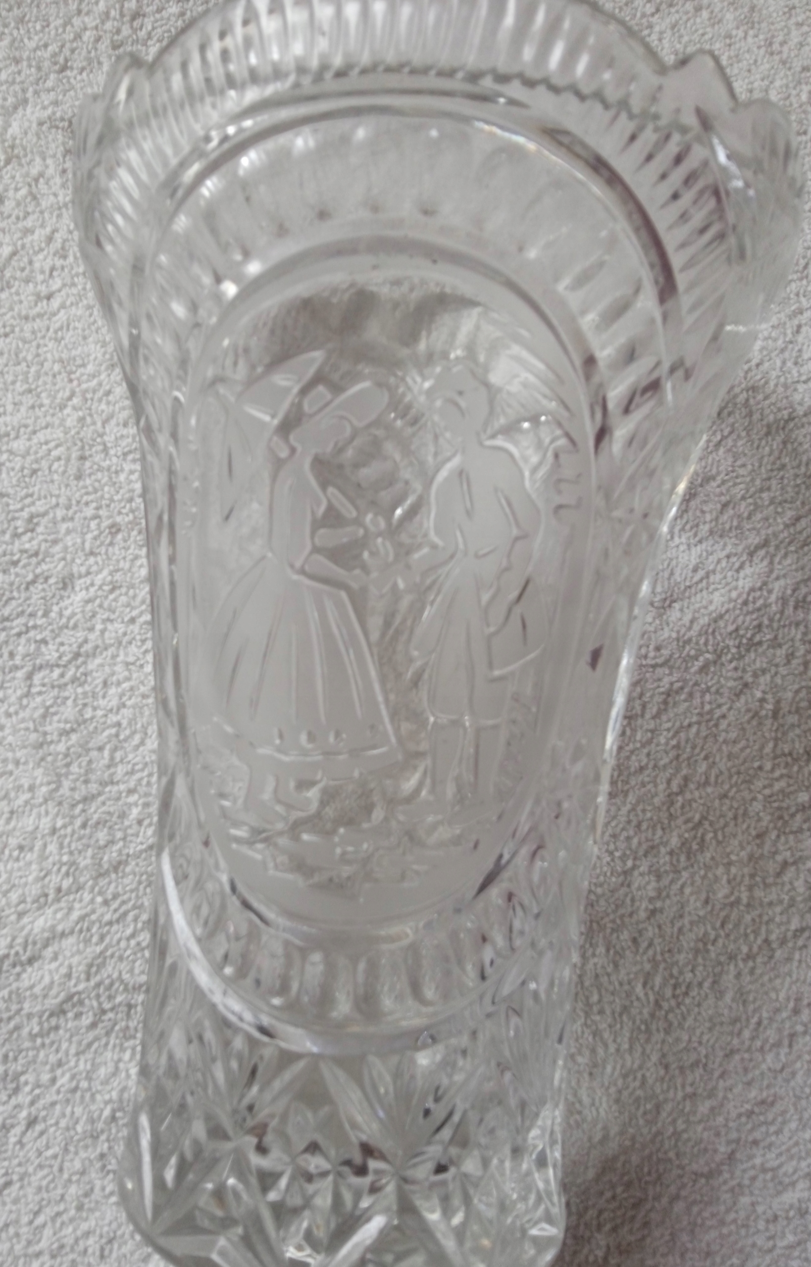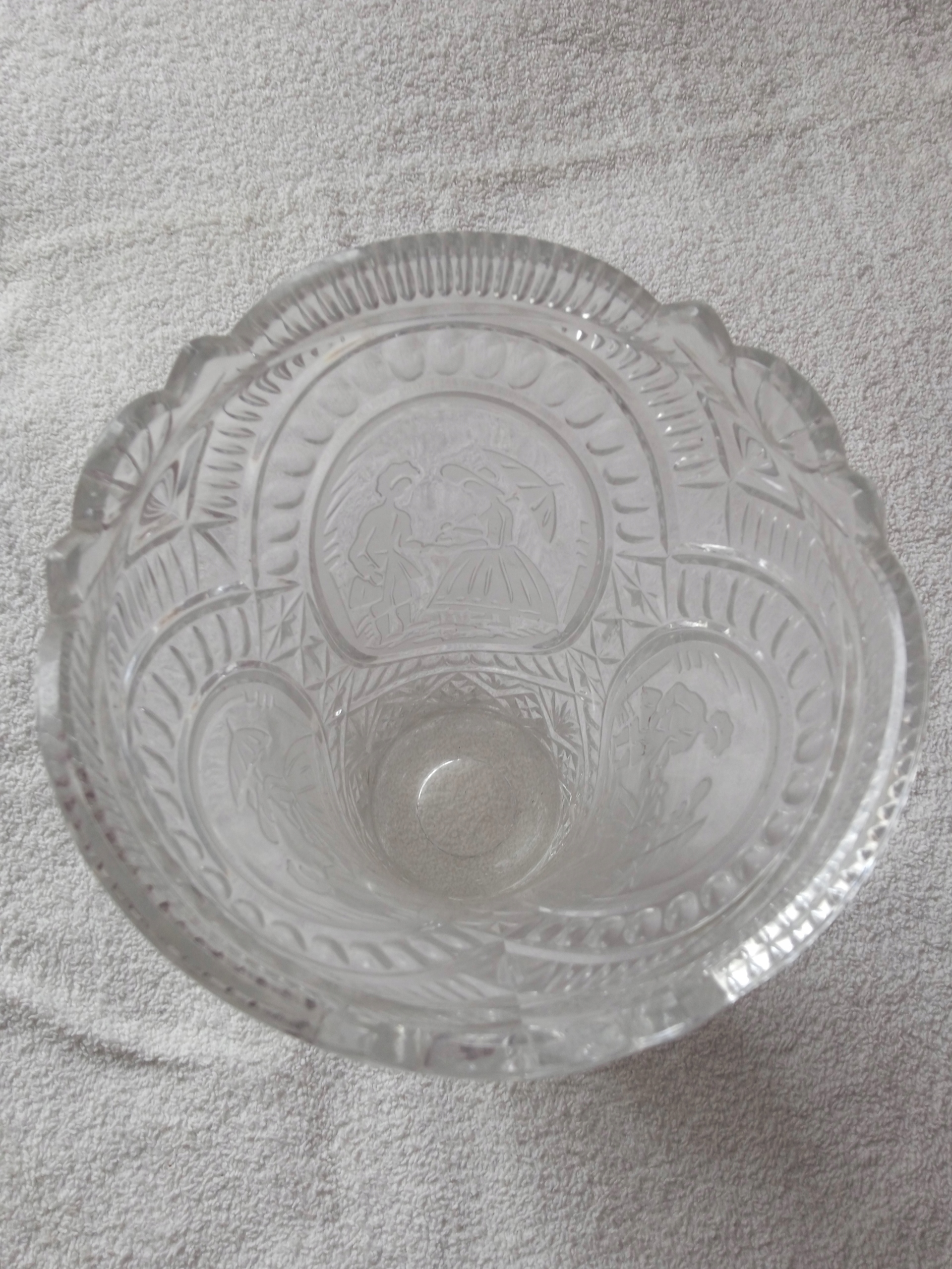 Kryształowy wazon z grawerowaną scenką rodzajową.