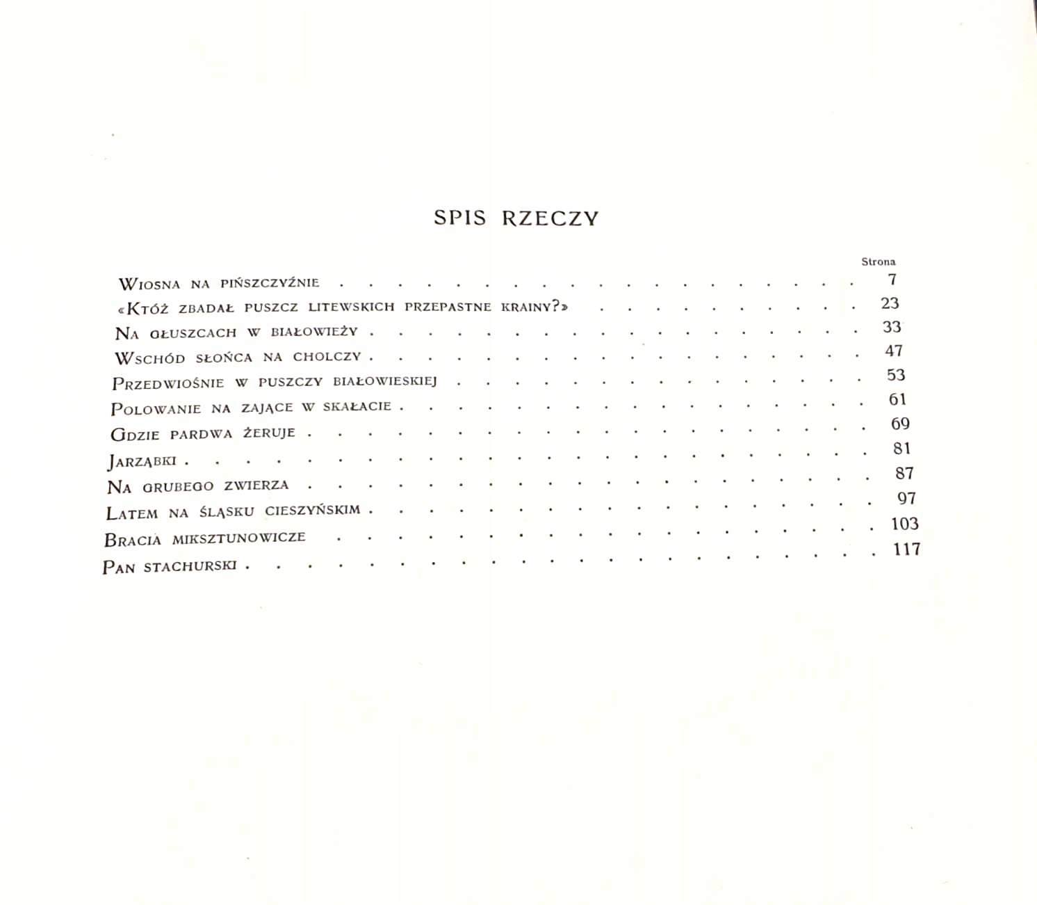 Включно в тому числі: Весна на Пінщині, На глухарях у Біловежі, Схід сонця в Хольчі, Літо в Цешинській Сілезії. Ілюстрації в тексті.