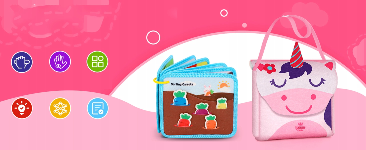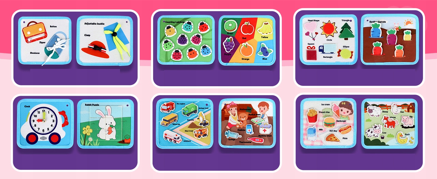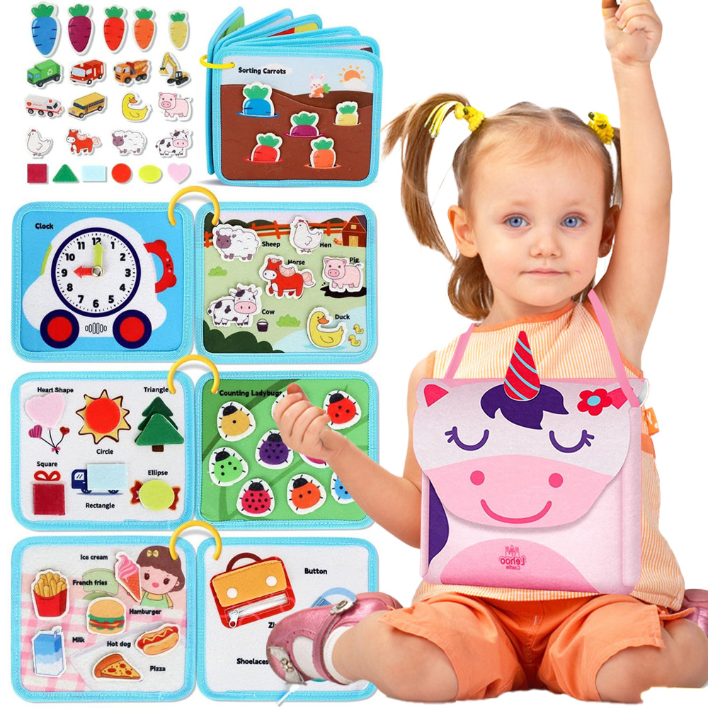 Наша дошка Монтессорі для малюків виготовлена з м’якого фетру без гострих країв, не містить флуоресцентних тканин і всі частини надійно закріплені. Портативну сумку через плече малюки легко зберігати та носити, поки у них є незліченна кількість захоплюючих розваг, а також це обов’язкова річ для маленьких дітей у дорозі, щоб вони були зайняті та тихі в автомобілях та літаках.