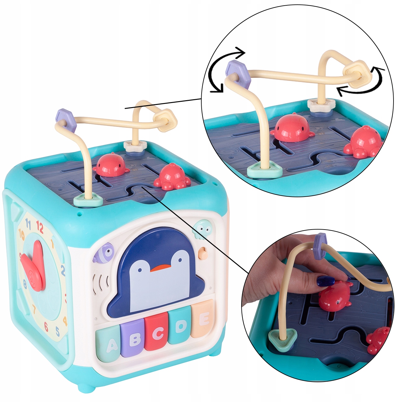 Кожна зі стінок куба - це окрема гра/розвага, яка розвиватиме моторику дитини. , уява та креативність. Барвисті рухомі елементи, такі як лабіринт, пазл або колеса, що обертаються, привернуть увагу кожного малюка
