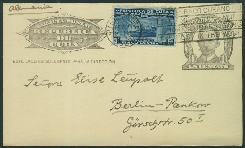 Куба Cp - 1 цент. знак +. - 1929 Гавана через Берлін