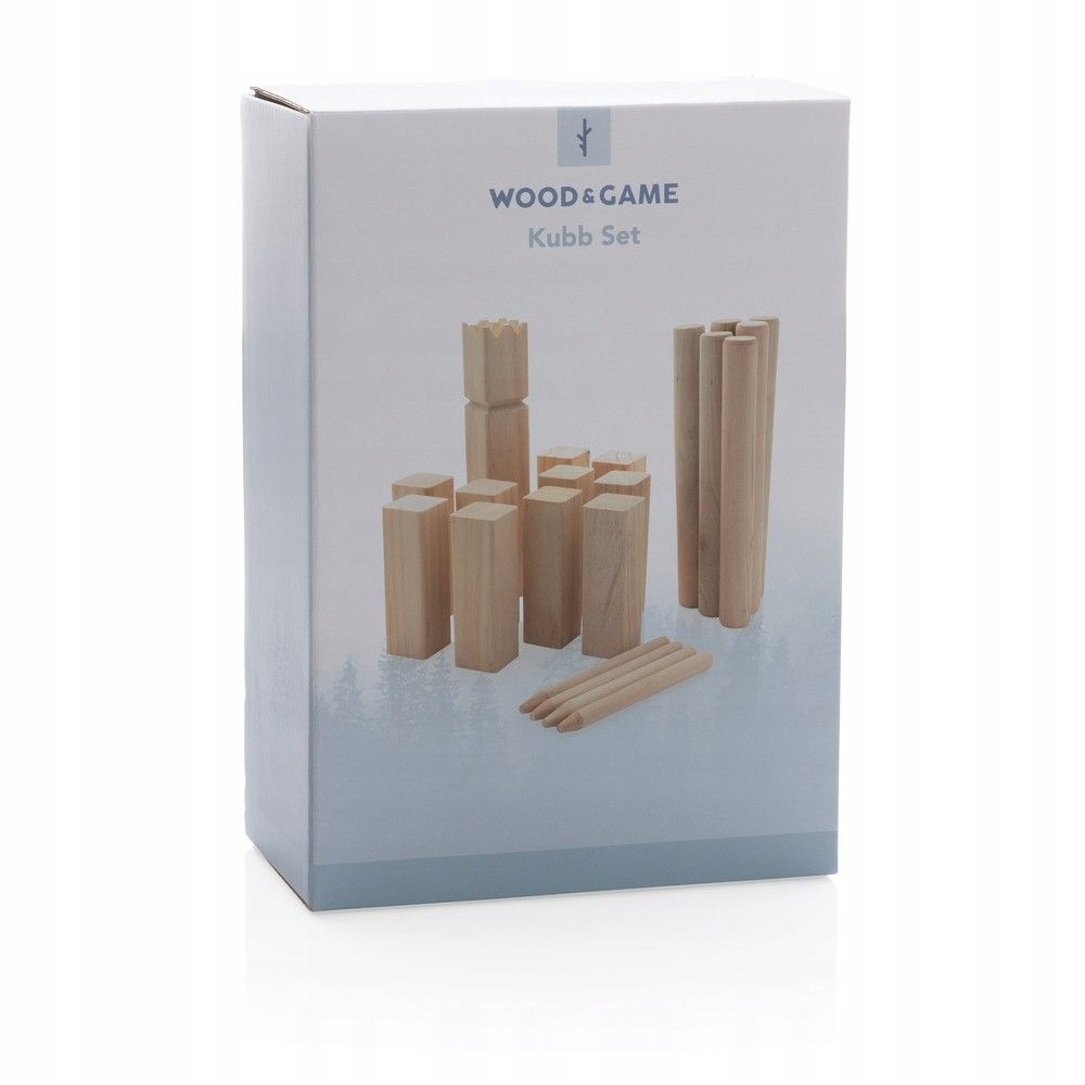 Kubb park game, the aim of the game is to knock down the "knights" of other teams by throwing throwing sticks from a distance of several meters, the set includes 1 king, 6 throwing sticks, 10 knights and 4 corner sticks, the king and knights made of pine wood, throwing sticks and corner sticks made of eucalyptus, cotton cover and instructions with Правила гри включали