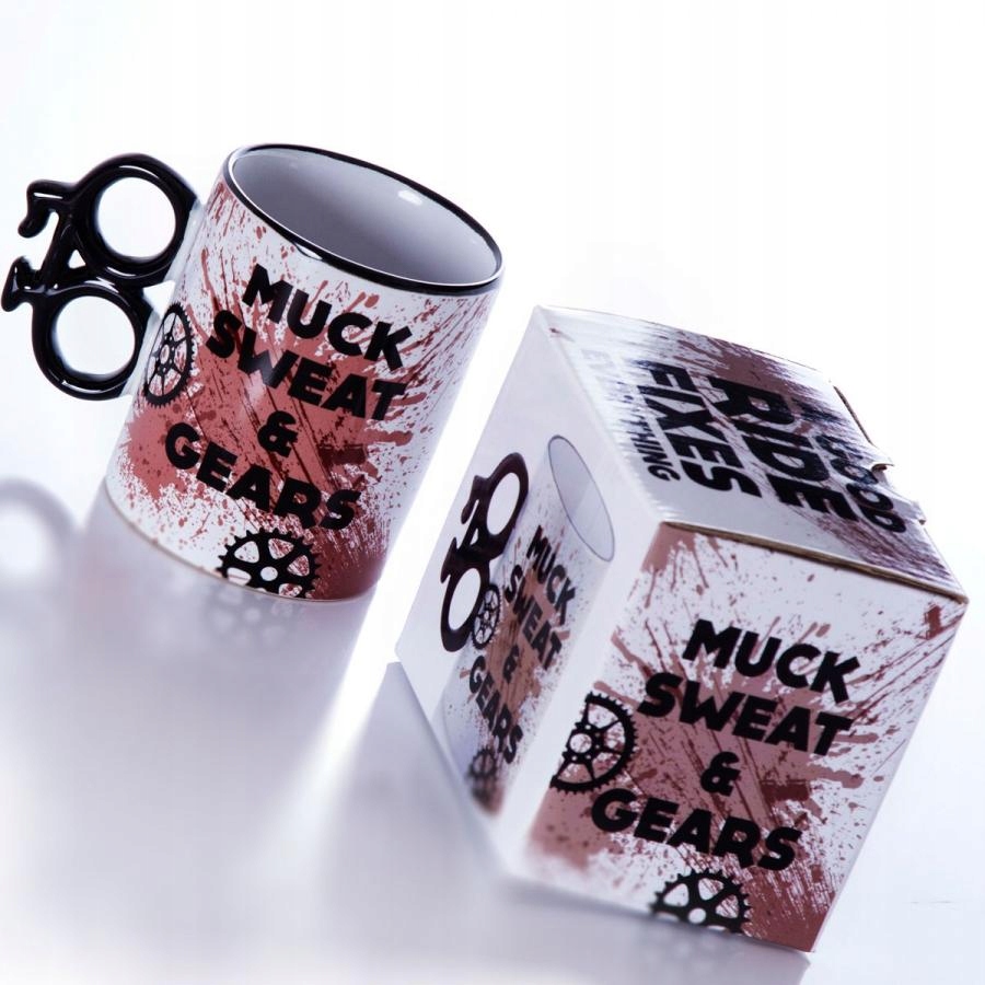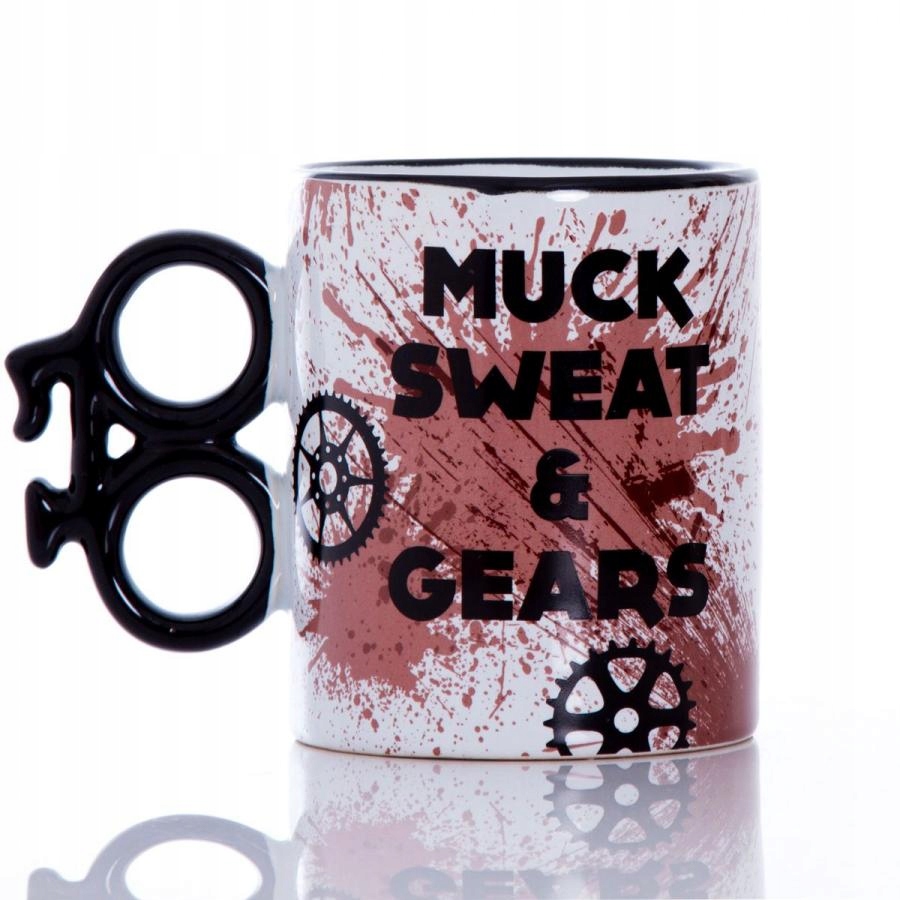 - на кухлі напис "Muck, Sweat & Gears", тобто "Грязь, піт" and gears"
