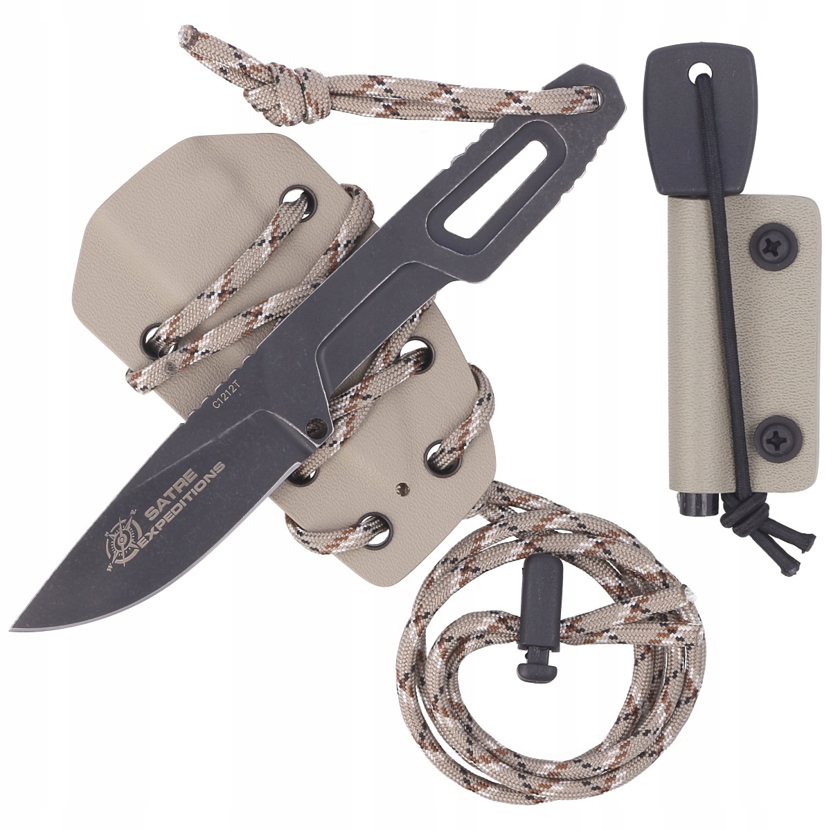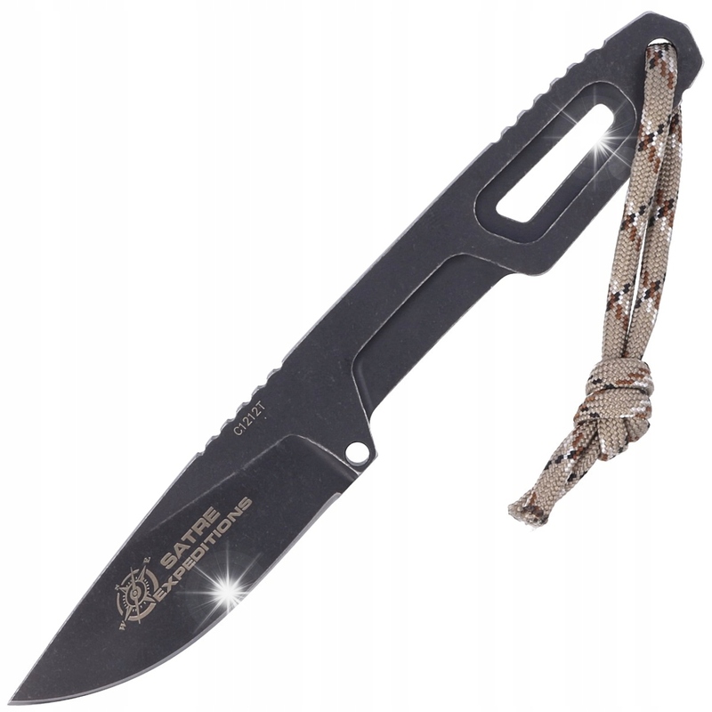 Satre Expeditons Dark Stone, нож нож для шиї з постійним клінгом з екстрактом темним каменем піхвом, пристосованим для повіслення на шию, жилеті, іншій кабурі або необов'язково на поясі. Співпраця з Даніелі Дал Канто , інструктором виживання в глибоких скорочень. Арочний підріз, на задній панелі капота рампа / хребет був розроблений таким чином, щоб він полегшив задню частину великого пальця або пальця , що вказує відповідно до бажаної техніки роботи. Інструмент для професіонала, а не тільки.