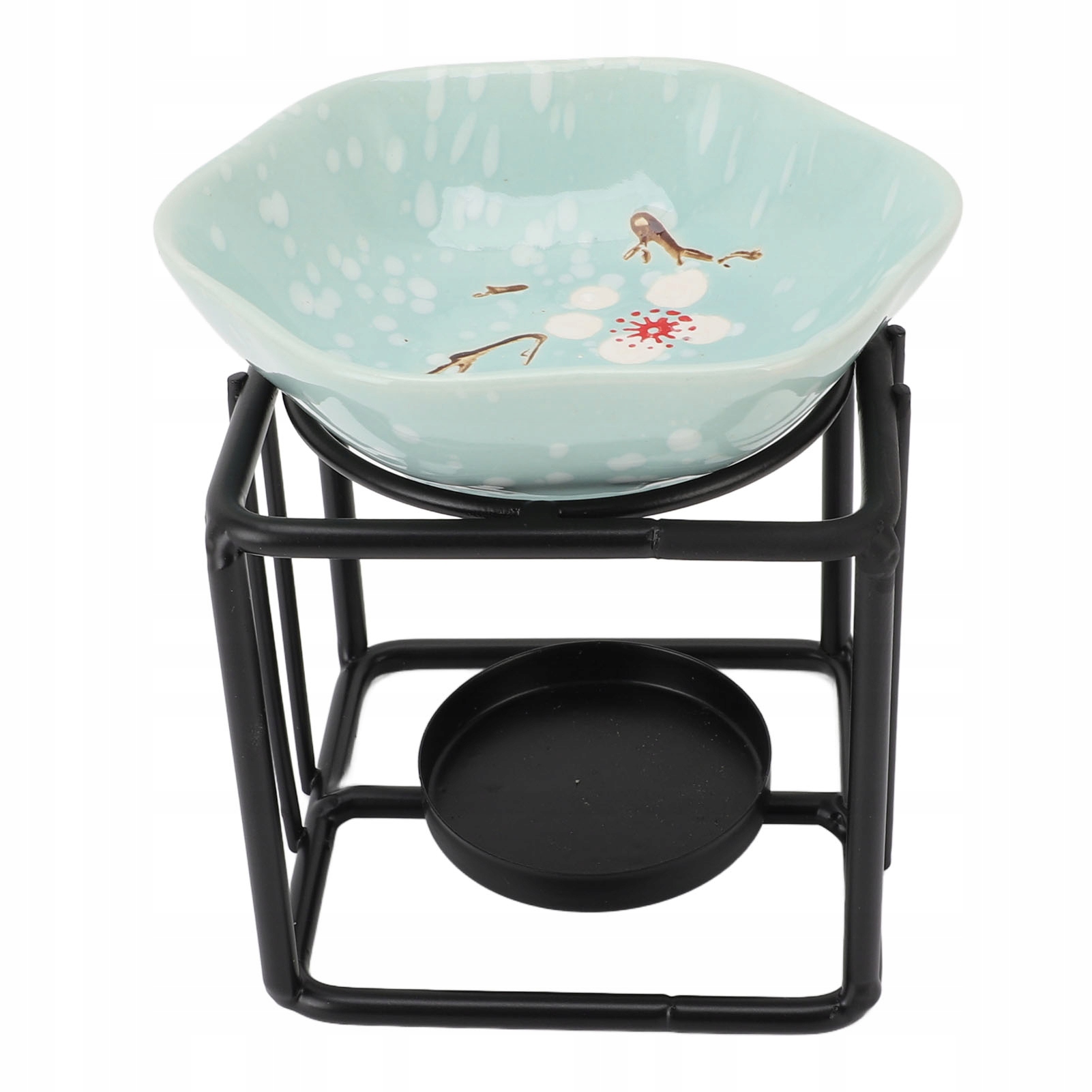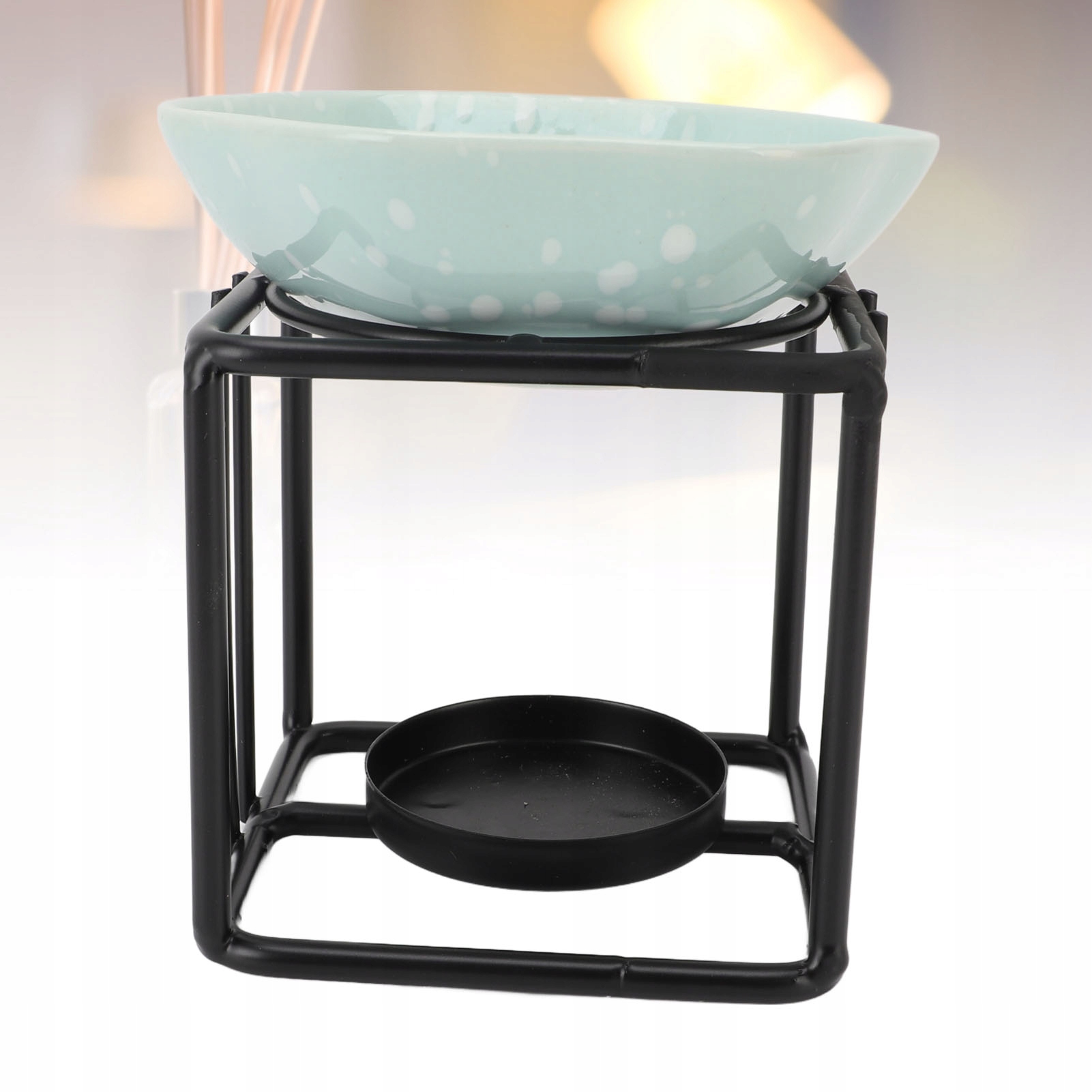 1. Підставка для заліза для глазурі: Цей ароматерапійний пальник має характерну підставку для куба заліза, забезпечуючи сучасні та суцільні рамки, що покращує його візуальну привабливість. Рука -виробна конструкція їсть естетичну елегантність із твердими матеріалами.