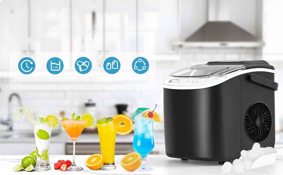 🧊Портативний і компактний льодогенератор. Наш льодогенератор має компактний дизайн і постачається з ручкою, що полегшує транспортування. Ви можете використовувати міні-портативний настільний льодогенератор будь-де, він ідеально підходить для кухні, офісу, бару, кемпінгу, автофургону чи вечірок.