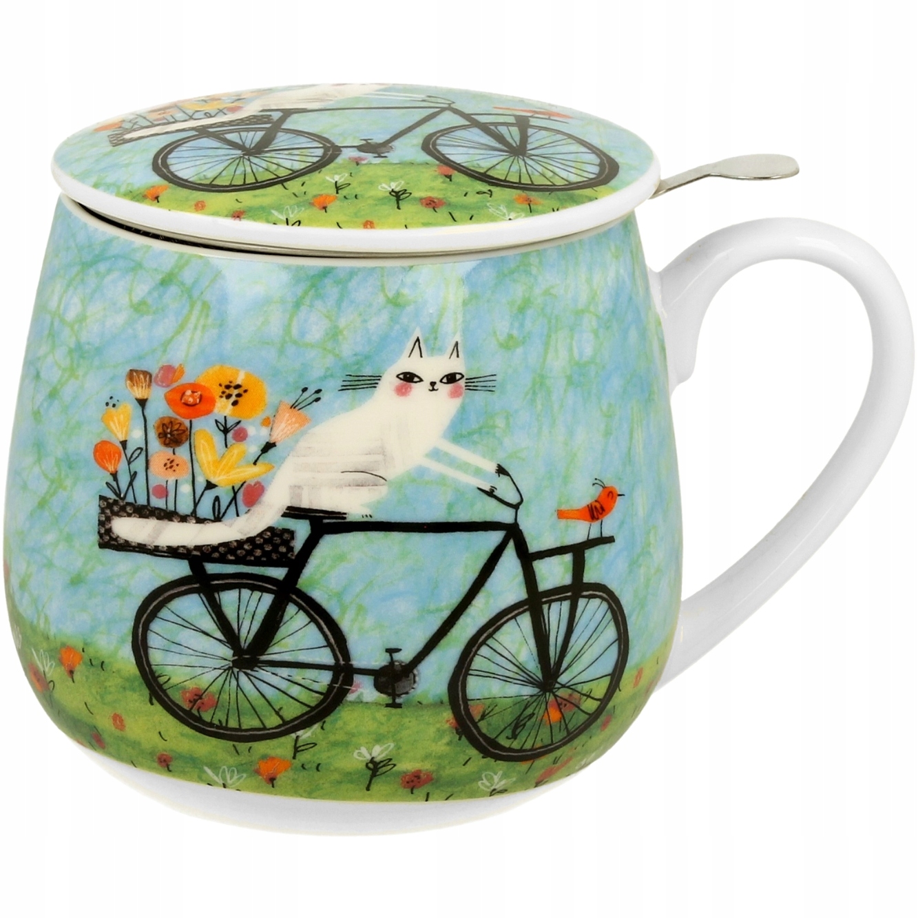 - Елегантний, порцеляновий кухоль бочки, із зображенням пофарбованого білого кошеня на класичному велосипеді