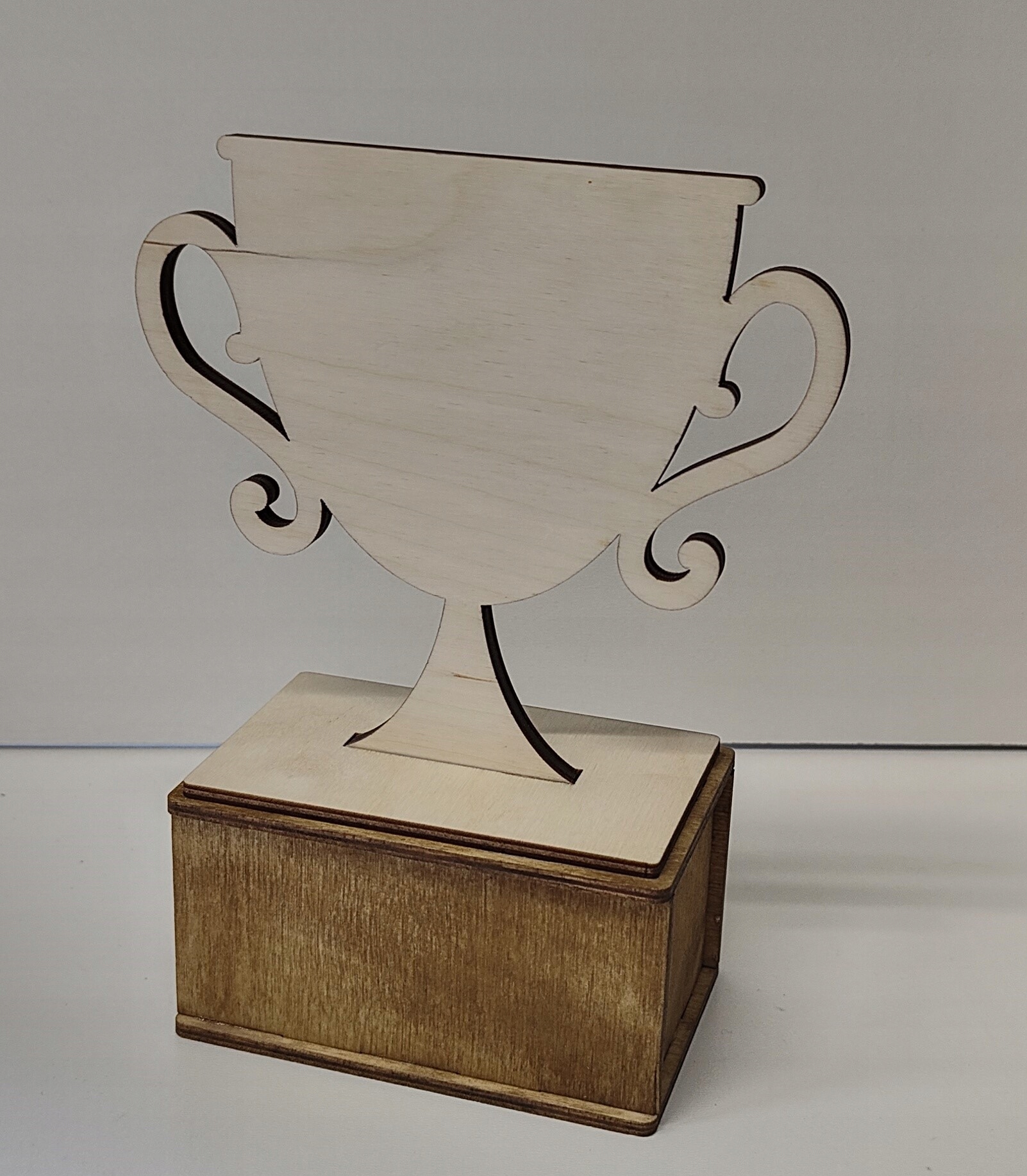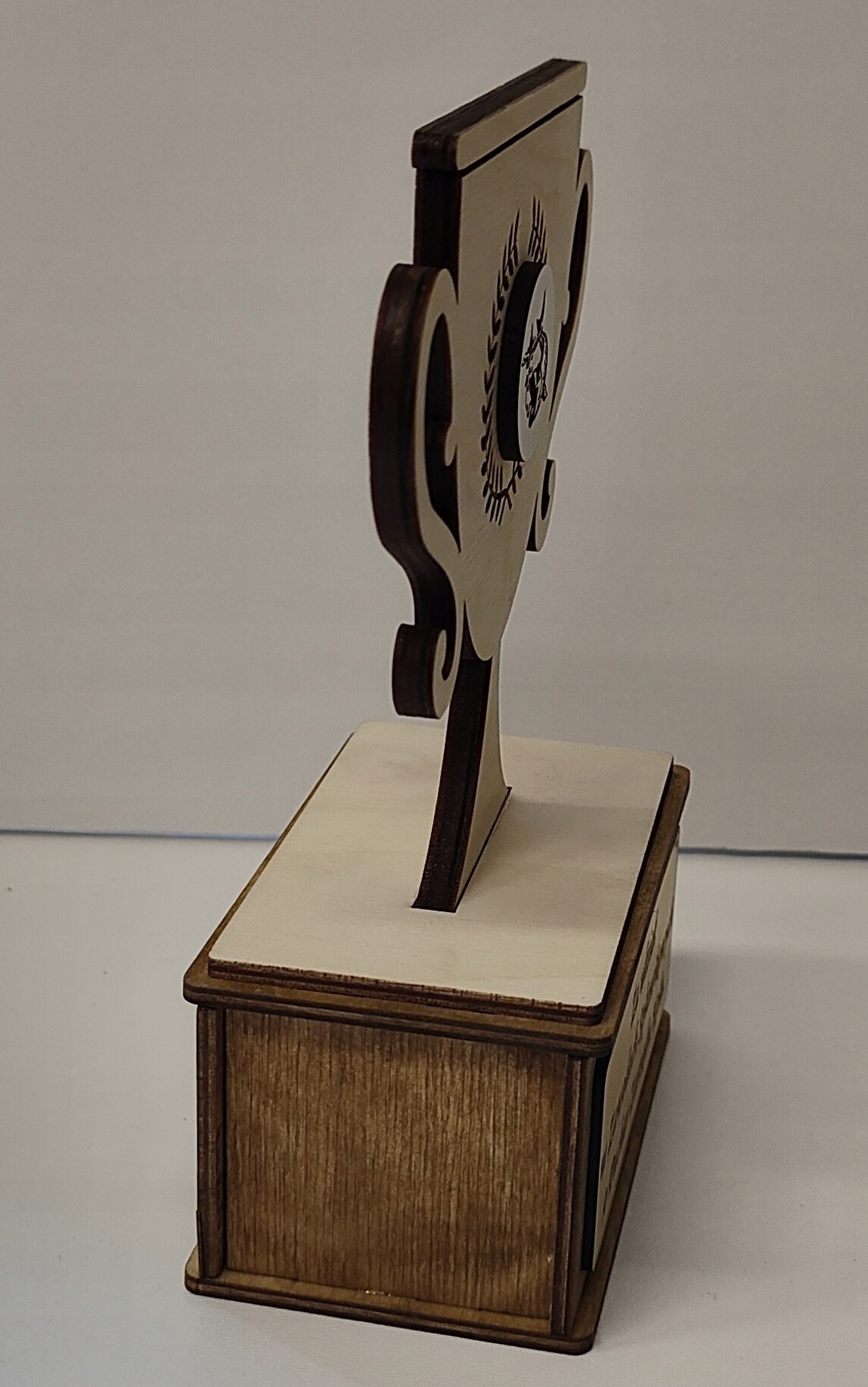 Оригінальна, красива і неповторна статуетка виготовлена з комбінації чистої та просоченої фанери кольору дуб. Крім того, ламінат з гравіюванням доповнює все.