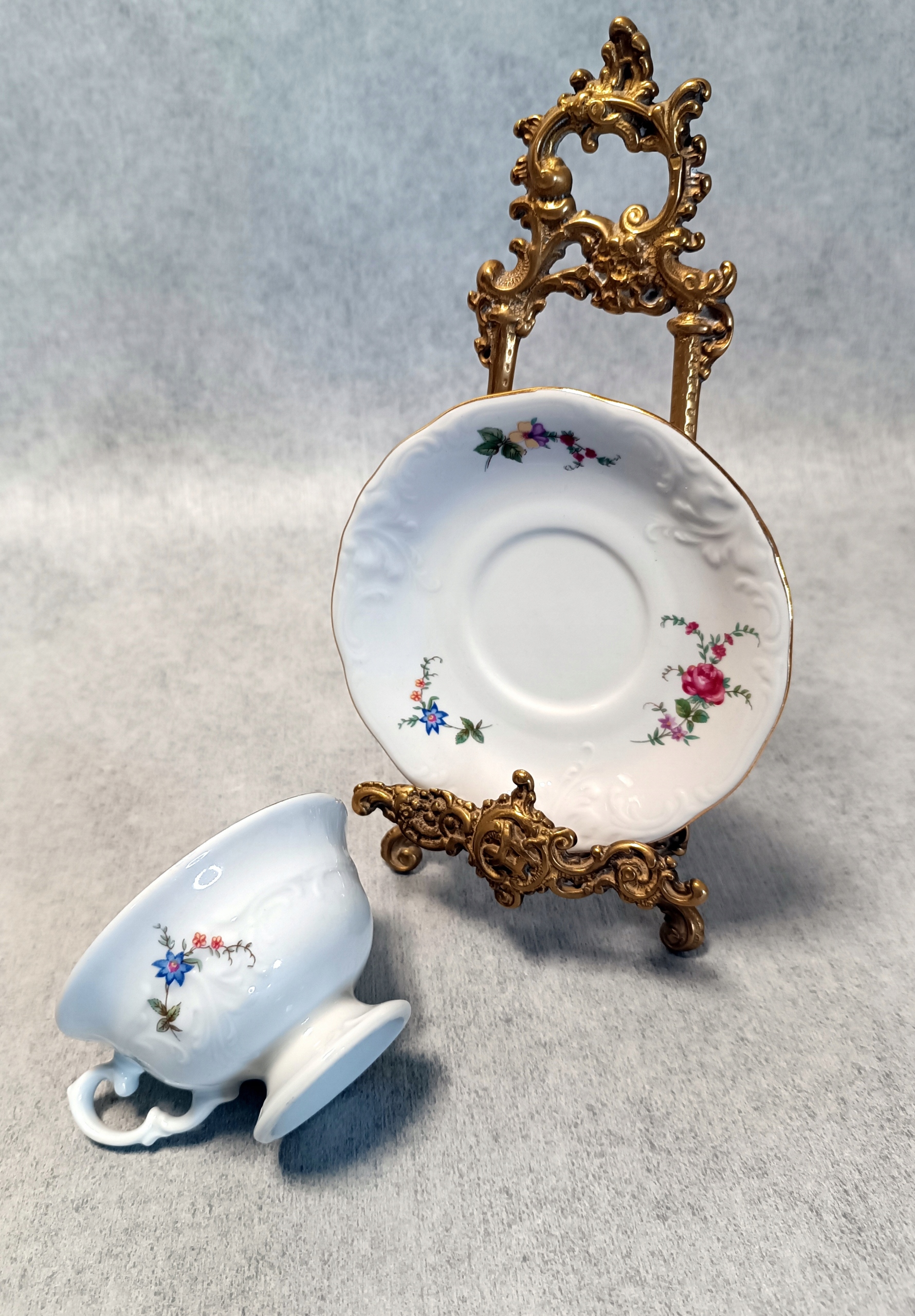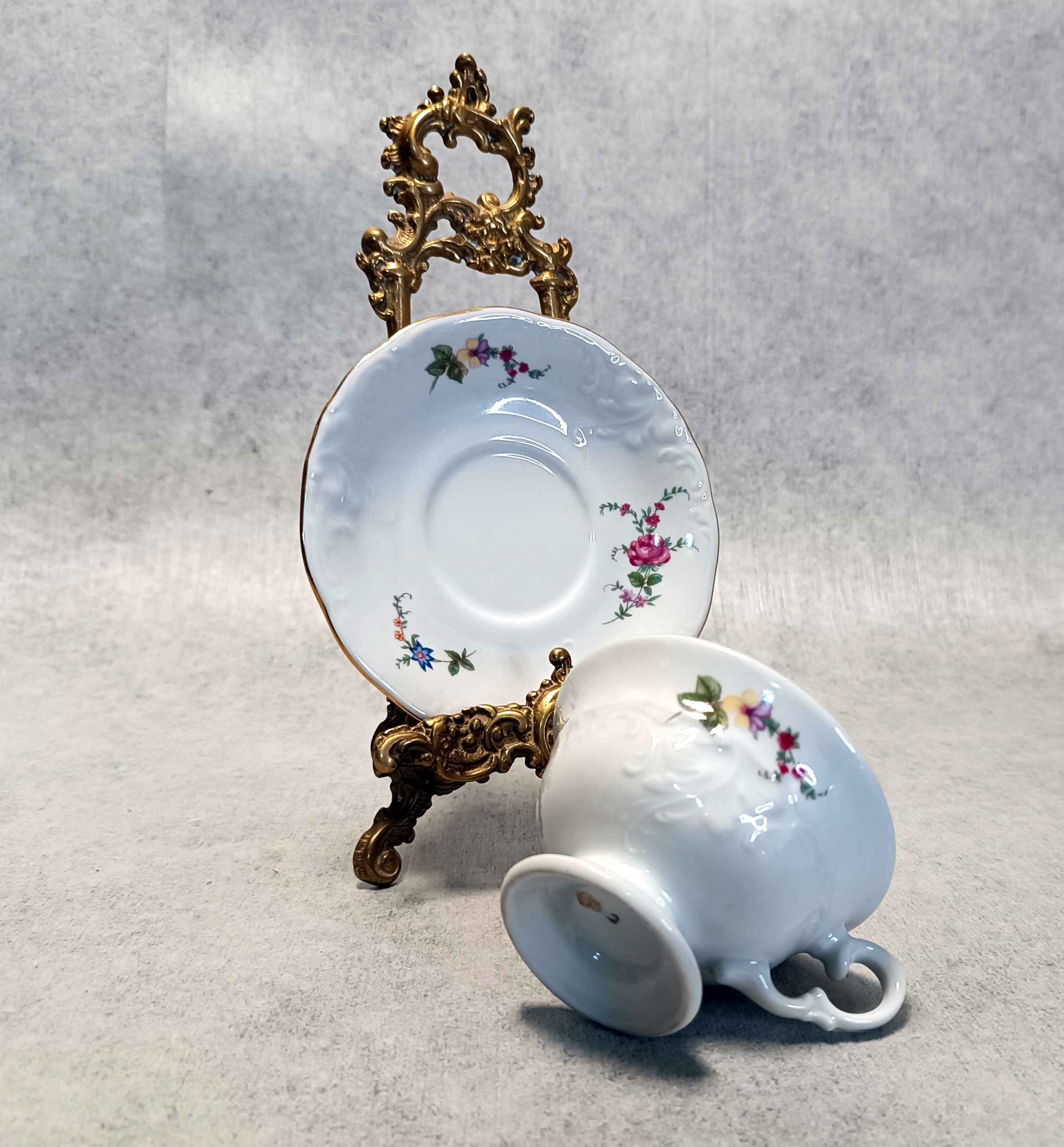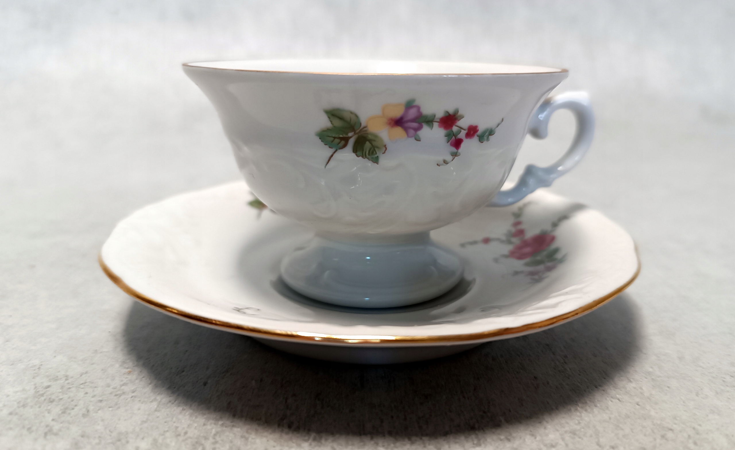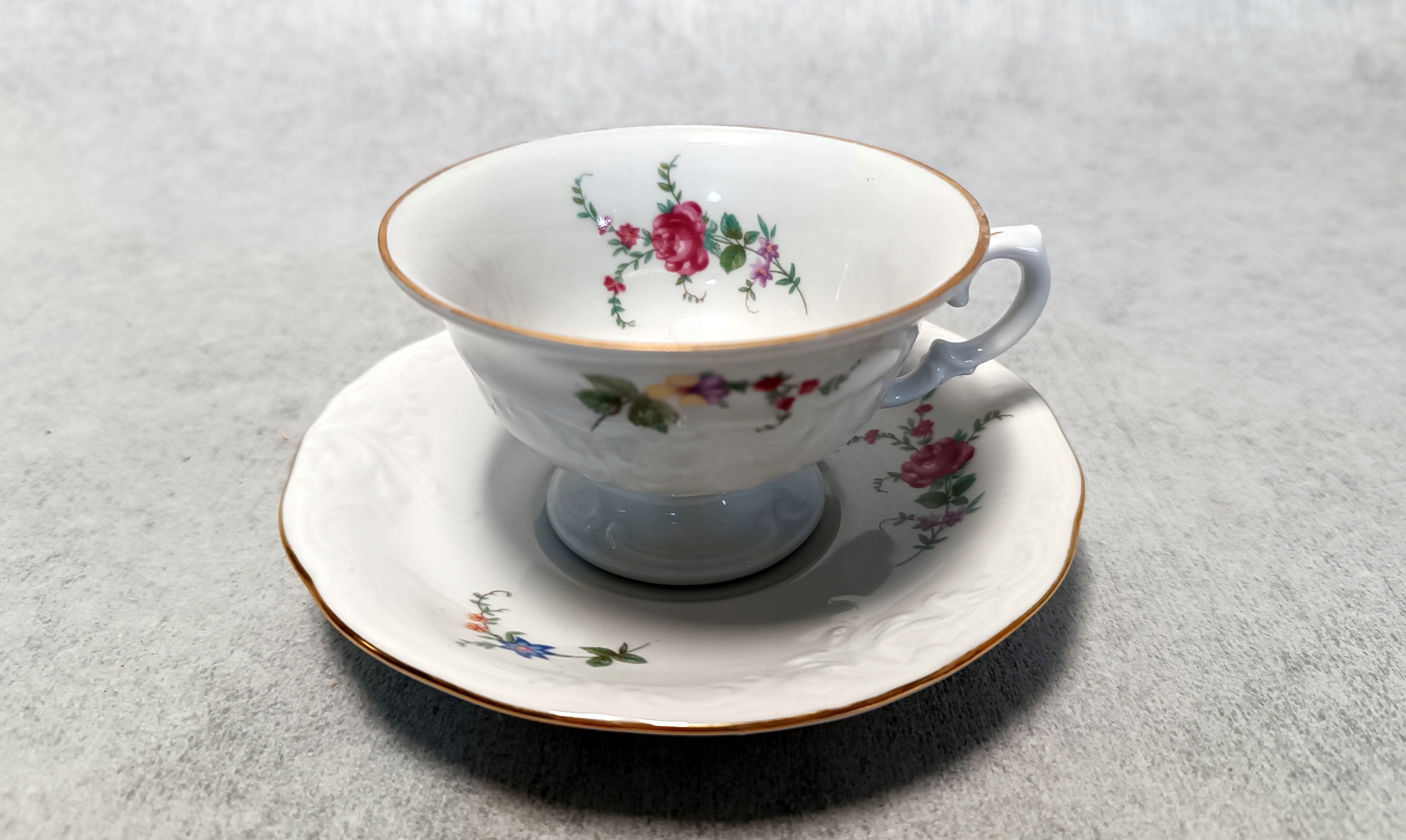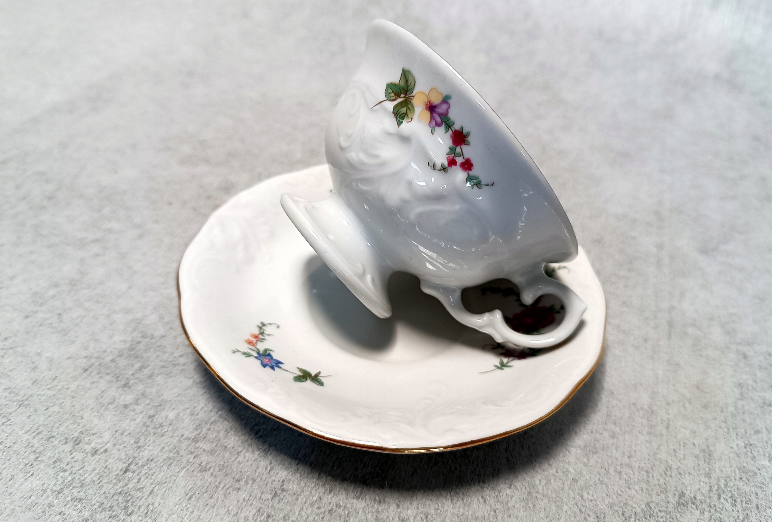 Біла порцеляна, класична форма чашки на ніжці, багато прикрашена рельєфами. >