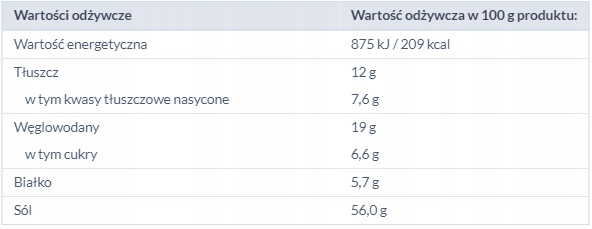 Склад: Сіль, пальмовий жир, крохмаль, підсилювачі смаку: глутамат натрію, динатрію 5'-рибонуклеотиди, цукор, екстракт яловичини (2%), барвник: аміачна карамель, ароматизатор, регулятор кислотності: лимонна кислота