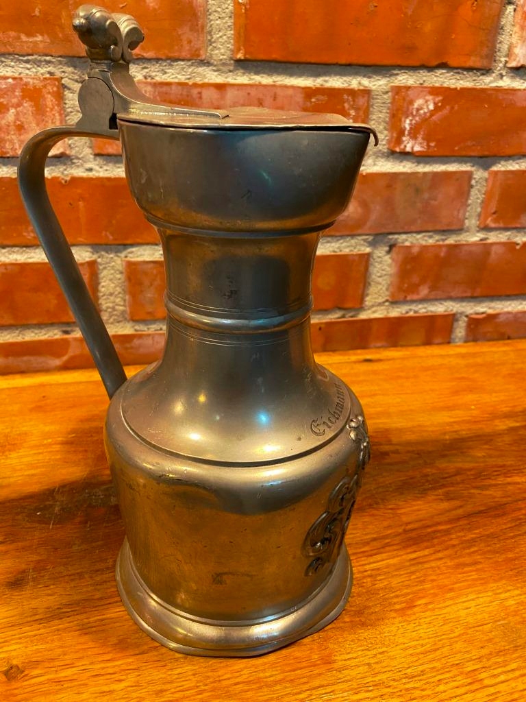 Колекційний кухоль/глечик для пива/вина. Тип: метал/жесть. Кружка походить з 1950-х років. Кружка в хорошому стані, може стати гарною прикрасою для колекції або облаштуванням пабу, корчми чи іншого цікавого інтер'єру.