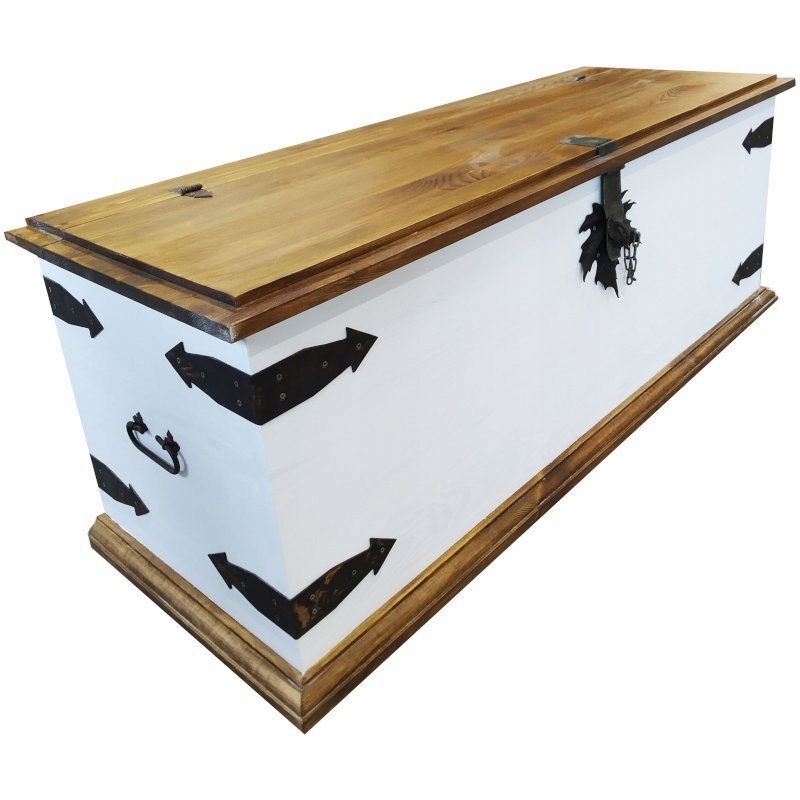 Скриня повністю виготовлена змасиву сосни. Завдяки поєднанню класичного сільського стилю з сучасними кольорами меблі стають водночас дуже сучасними.