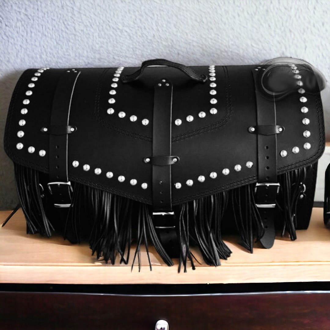 ⚠️Чорний шкіряний мотоциклетний багажник 57 літрів, блискавка, 2 шоломи - з бахромою