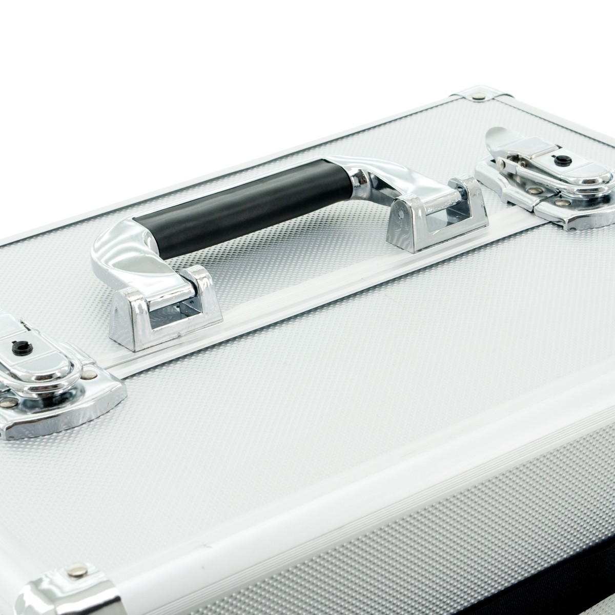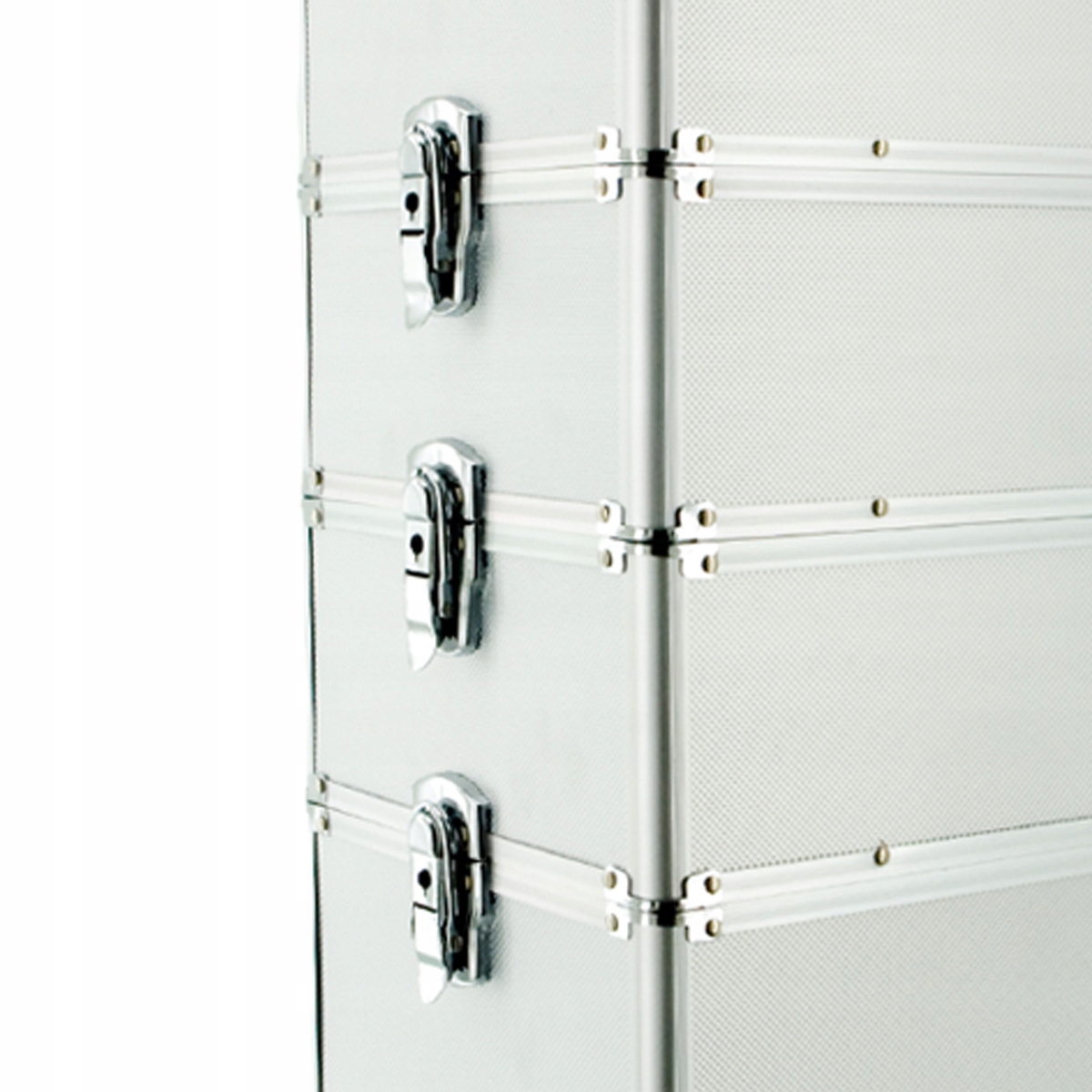 Валіза поділена на чотири частини - верхня частина відкривається зверху та має >чотири висувних шухляди для лаків для нігтів або дрібних аксесуарів, дві однакові середні частини для більших речей і велике відділення, яке вміщує більшість доступних манікюрних ламп та багато інших пристроїв.
