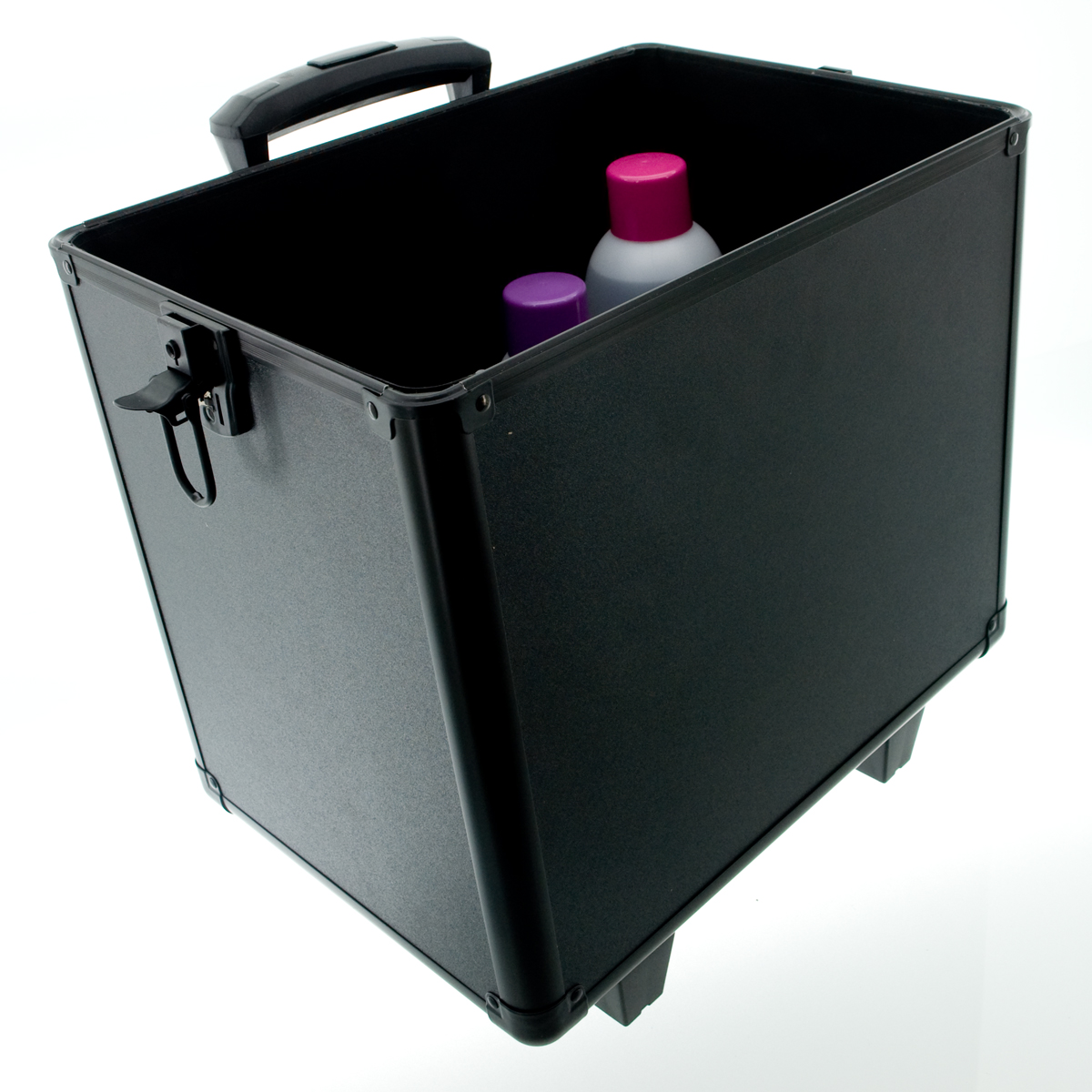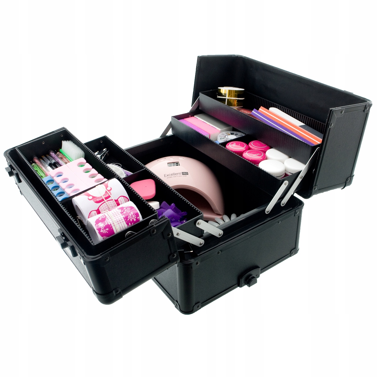 Валіза поділена на чотири частини - Верхня частина відкривається зверху, має чотири висувних ящика для лаків для нігтів або дрібних аксесуарів, два однакові середні частини для більших предметів і велике відділення, яке вміщає більшість доступних манікюрних ламп та багато інших пристроїв.