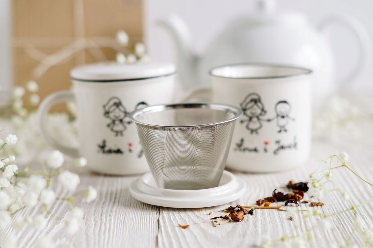 - Кожна кухоль має ситечко для заварювання та кришку з слово "любов".