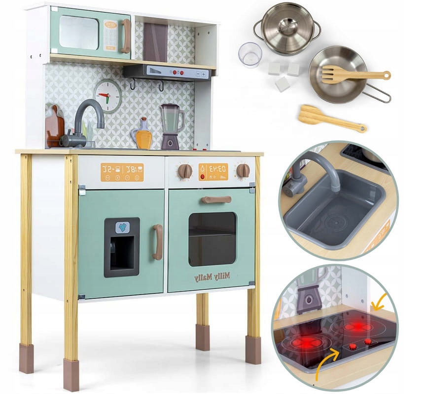 Наша дерев'яна кухня з аксесуарами - це не тільки іграшка, але й один із основних інструментів підтримки розвитку дитини. Надійна робота, реалістичні деталі та навчальний аспект гри роблять цю дерев'яну кухню улюбленою іграшкою для дітей, завдяки якій вони зможуть безпечно та привабливо розвивати свої кухонні навички. Веселощі ще ніколи не були такими барвистими та повними радості! Кухня росте разом з дитиною завдяки використанню регульованих ніжок.