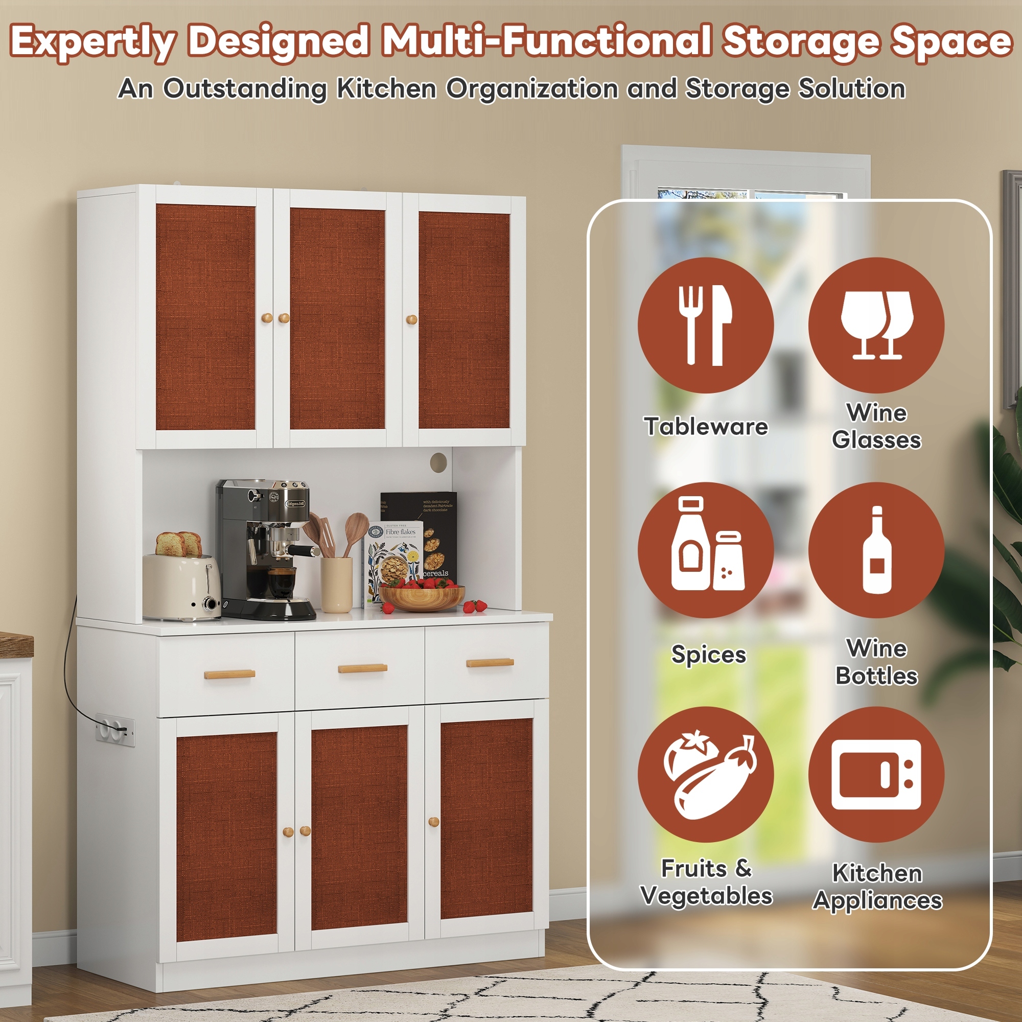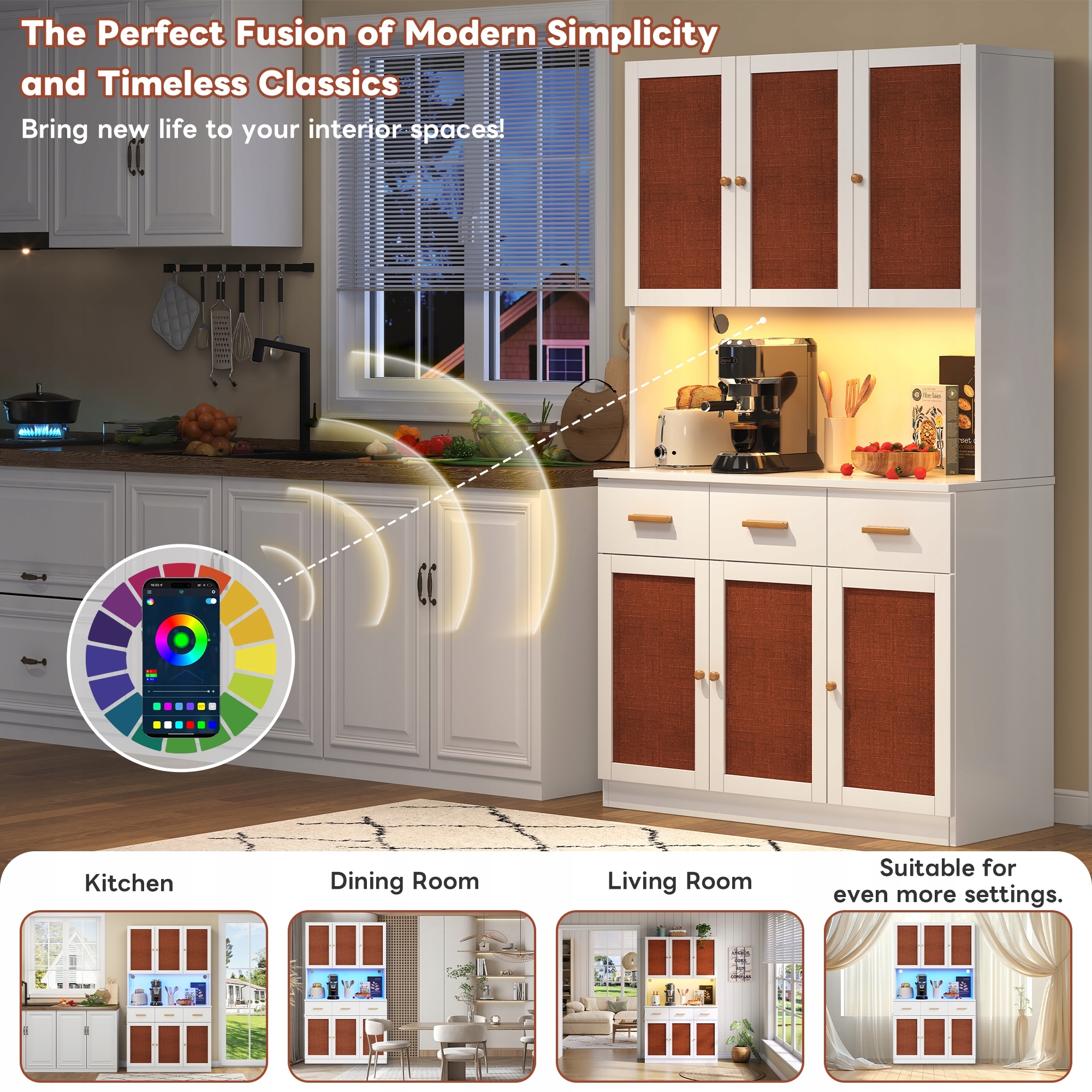 Кухонна шафа-буфет 182 см, висока кухонна шафа зі світлодіодним освітленням і розеткою, біла шафа з тканинними дверцятами та ручками з масиву дерева, місце для зберігання мікрохвильової печі, кавоварки та посуду