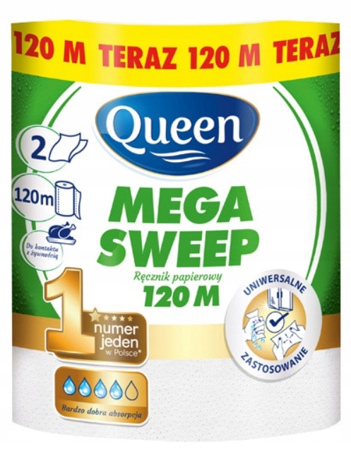 Кухонний рушник з королевою, відомий і відомий кожним брендом Mega Sweem Sweep з довжиною до 120 метрів. Паперовий рушник Queen, який призначений для кожної кухні з певною подією, а його запуск спричиняє багато домогосподарок по всій Польщі. Універсальні програми дозволяють використовувати його під час витирання шаф, роботи в гардеробах або навіть використовуючи його для їжі, наприклад, при позбавленні невеликої кількості з фрі. Міцні 2 шари структури целюлозного паперу, що дозволяє ретельно обернути і використовувати, не розриваючи рушник.