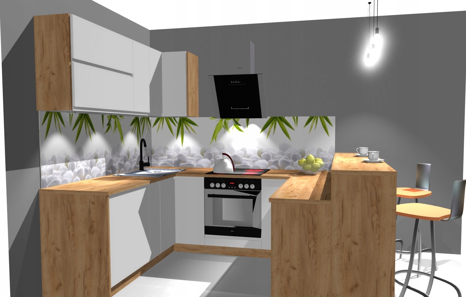 Цю кухню відрізняє горизонтальна лінія ручок у стоячих шаф, підвісні шафи відкриваються без використання накидних ручок, усе це робить всю конструкцію дуже сучасною. Поєднуючи таку форму білих фасадів зі стільницею кольору дерева, ми можемо візуально збільшити кухню, надавши їй гармонії, елегантності та сучасного вигляду.