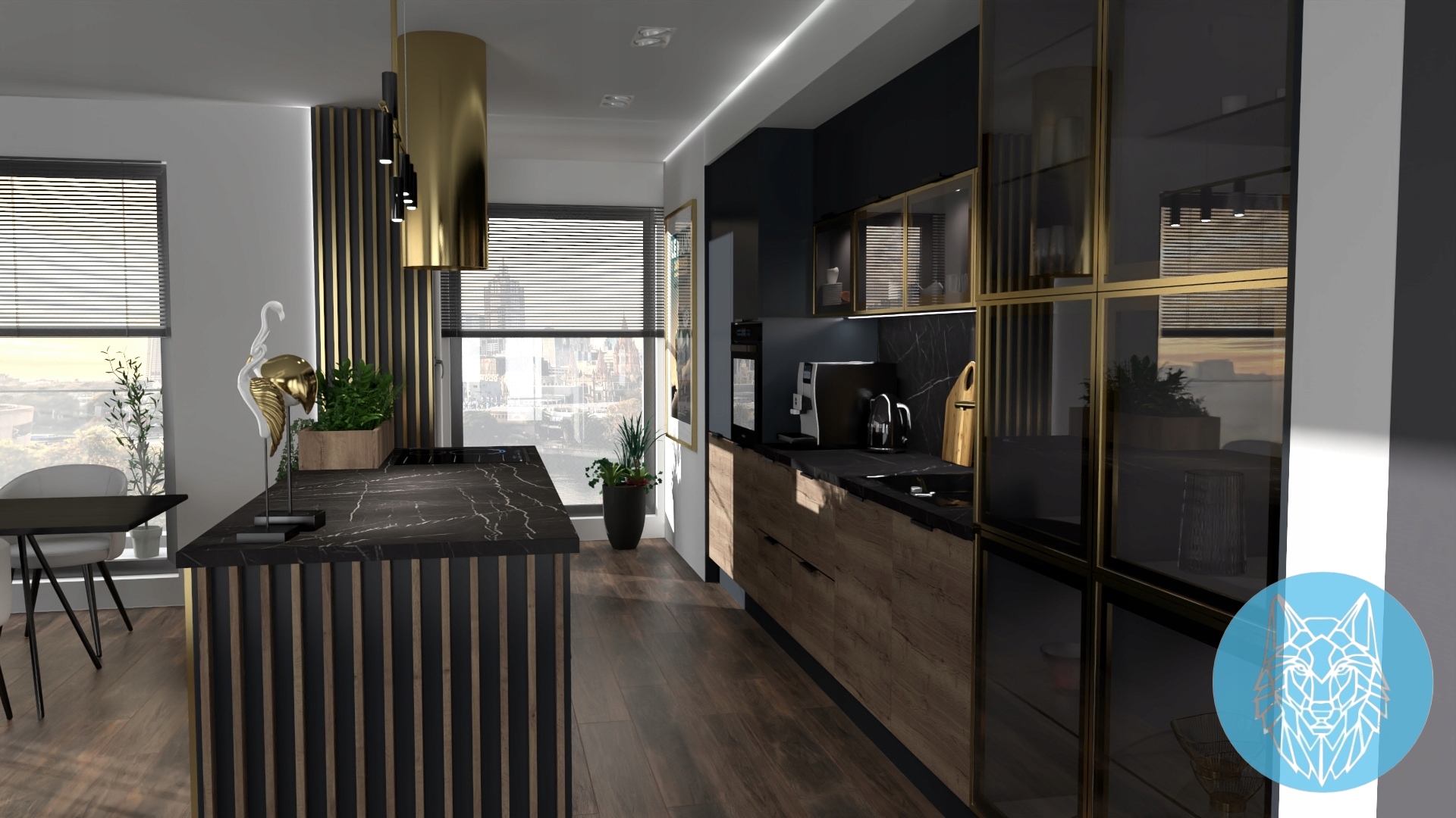 Красиве, оригінальне поєднання фасадів з матового чорного акрилу з декором Cleaf S063 і стільницею Griga Pietra Czarna, прикрашених золотими рамками вітрин. Цю кухню, безумовно, можна віднести до елегантного стилю лофт.