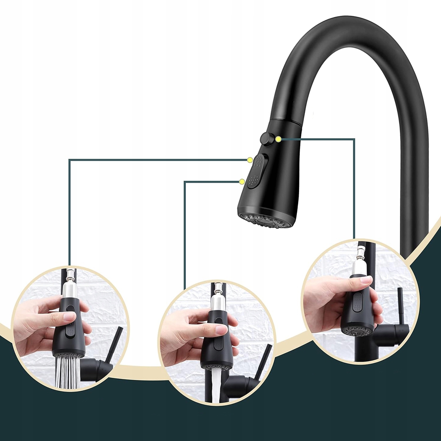 - Кухонний змішувач має 3 налаштування струменя (потік, бризок, пауза), що дозволяє перемикатися з аерованого струменя на потужний без будь-яких зусиль і кран для раковини.