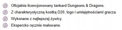 Просматривая «Dungeons & Dragons Collector Collector Mug с ручной, метал 15,5 см», вы можете быть уверены, что данный товар из каталога «[rubrica_name]» будет доставлен из Польши и проверен на целостность. В цене товара, указанной на сайте, учтена доставка из Польши. Внимание!!! Товары для Евросоюза, согласно законодательству стран Евросоюза, могут отличаться упаковкой или наполнением.