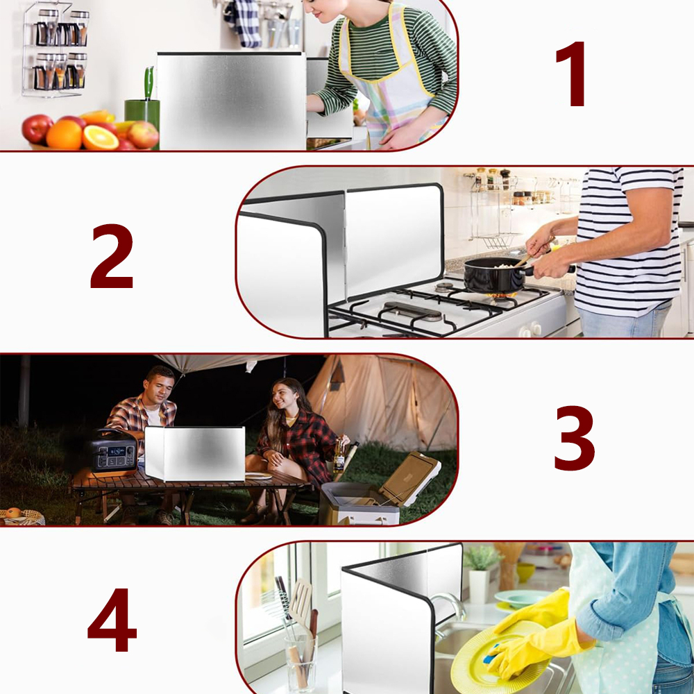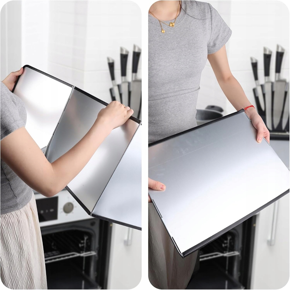 💪 БАГАТОФУНКЦІОНАЛЬНИЙ ТА ГНУЧКИЙ: ви можете скласти його у формі U або L, щоб ідеально відповідати вашому простору. Вона підійде не тільки при смаженні, але і як кришка для раковини під час миття посуду або нарізки, запобігаючи розбризкуванню води.