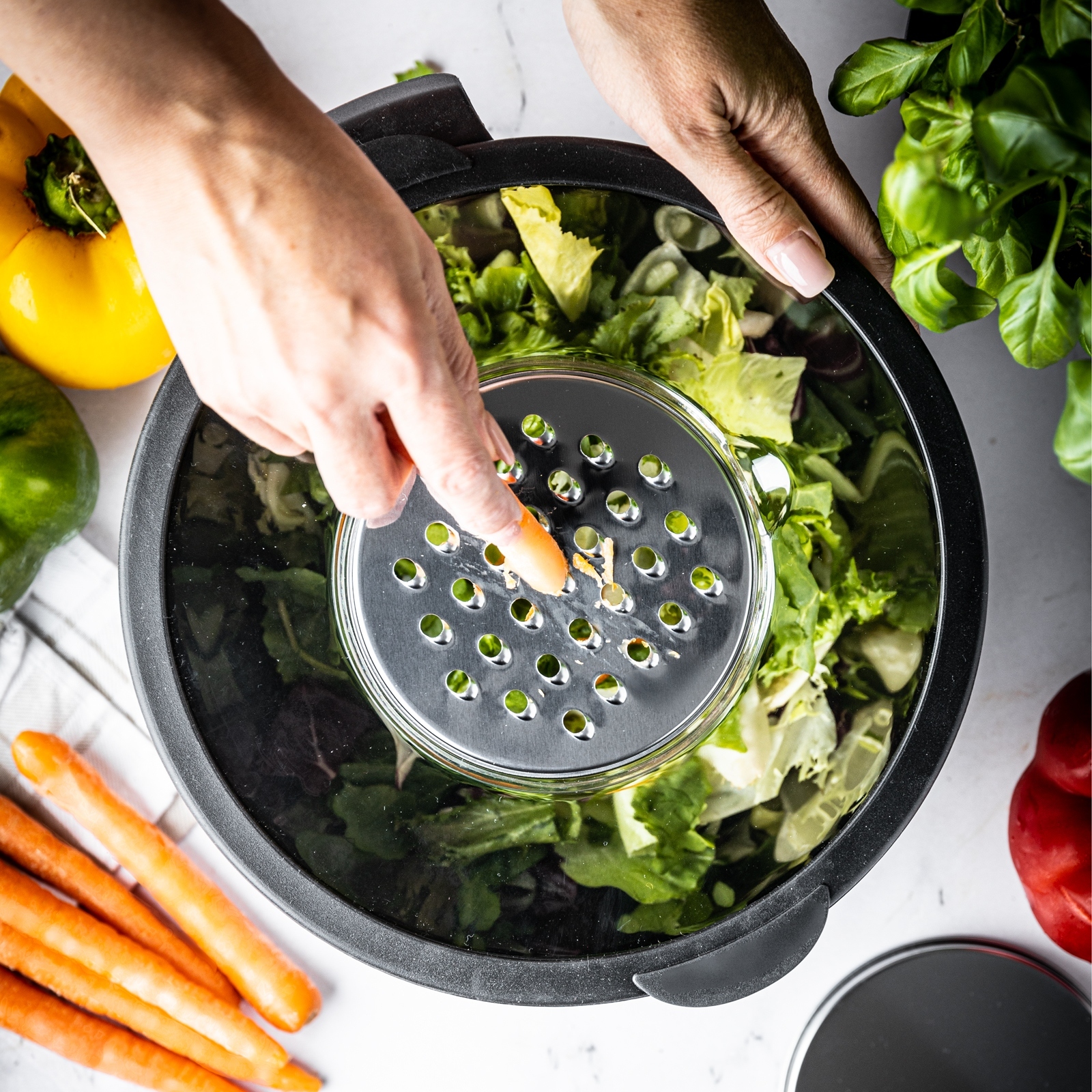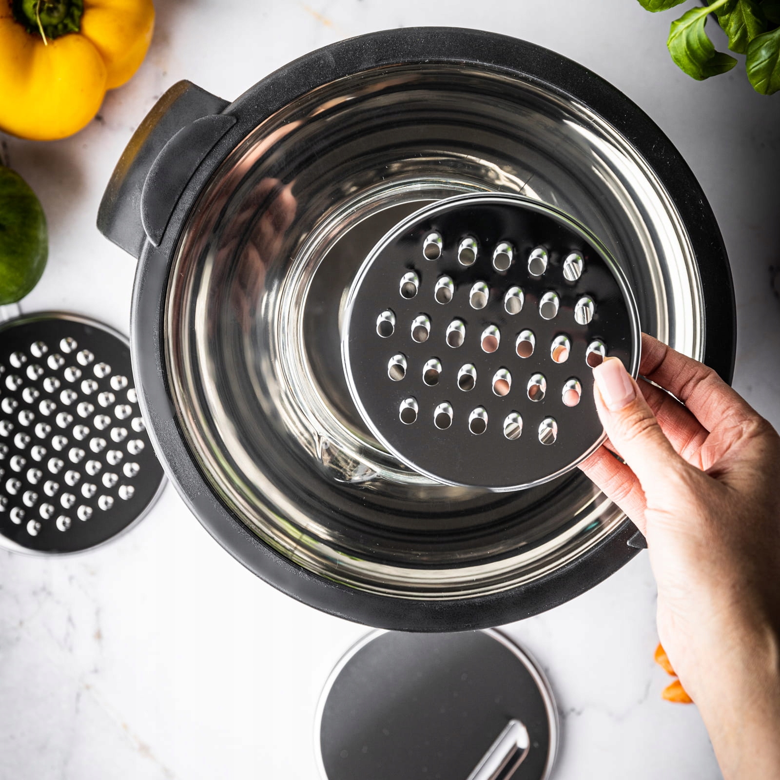 - Можливість терти овочі, фрукти, шоколад і багато іншого. інші продукти безпосередньо в миску. Герметична кришка дозволяє накривати та зберігати напр. тісто, терті овочі в холодильнику або морозильній камері.