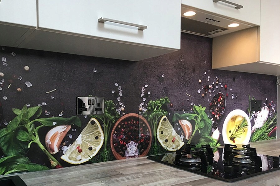 7) Чи можна використовувати панель ПВХ біля печі? Так. Ці панно для кухні ми друкуємо вже кілька років. Наші клієнти успішно використовують панелі, встановлені на кухні навіть з газовими плитами. Важливо, щоб панелі міцно приклеювалися до основи. Ми рекомендуємо клеїти панелі двостороннім губчастим скотчем і одночасно силіконовим монтажним клеєм, напр. для дзеркал. Під час монтажу чергуйте вертикальні смуги стрічки та клею. Слід уникати ситуацій, коли панель безпосередньо контактує з вогнем, напр. не ставте великі каструлі на конфорки поруч з панеллю і включіть газ на повний розігрів. Рекомендована відстань конфорки від панелі не менше 20 см. Осколок біля газової плити можна додатково закріпити склом, як показано на фото нижче: