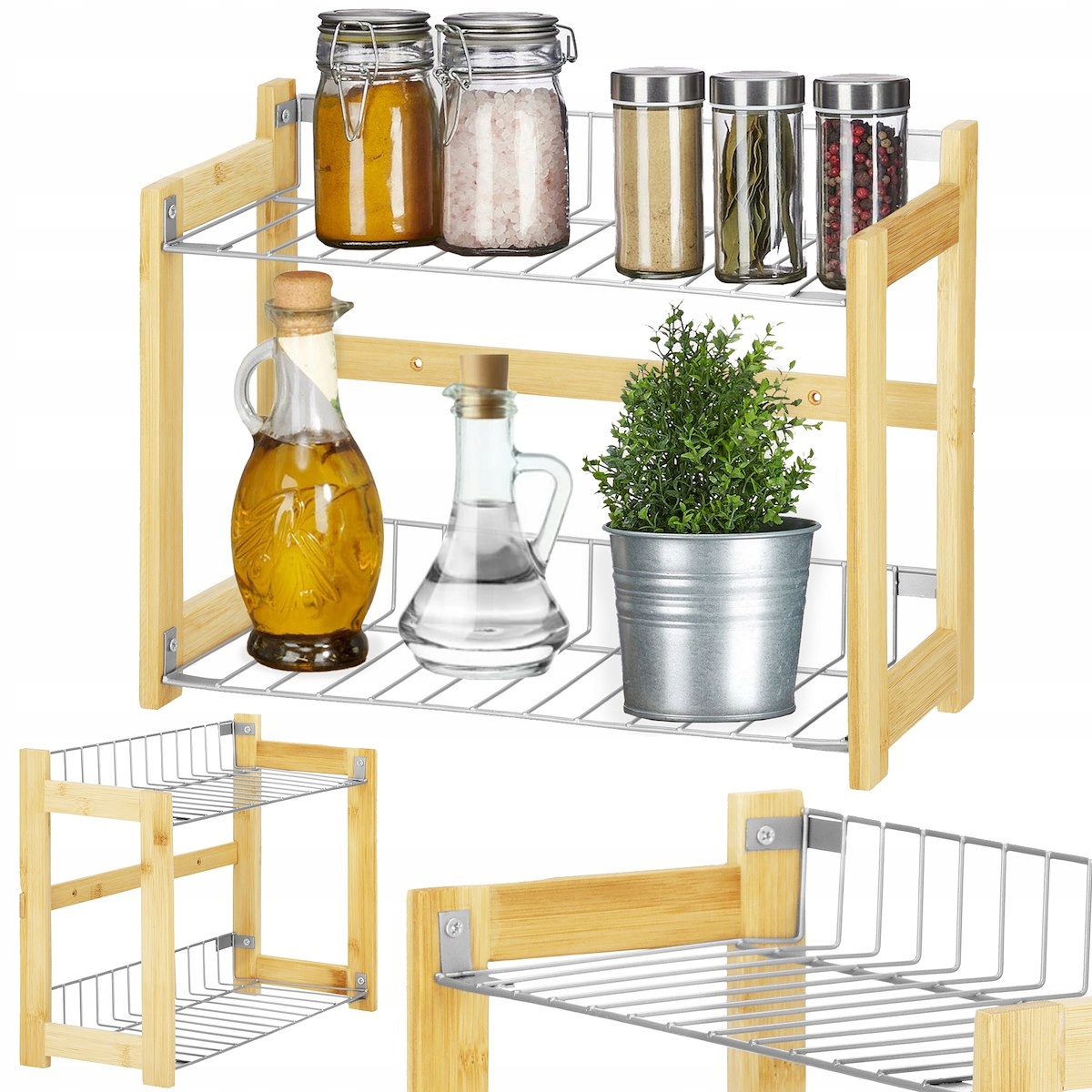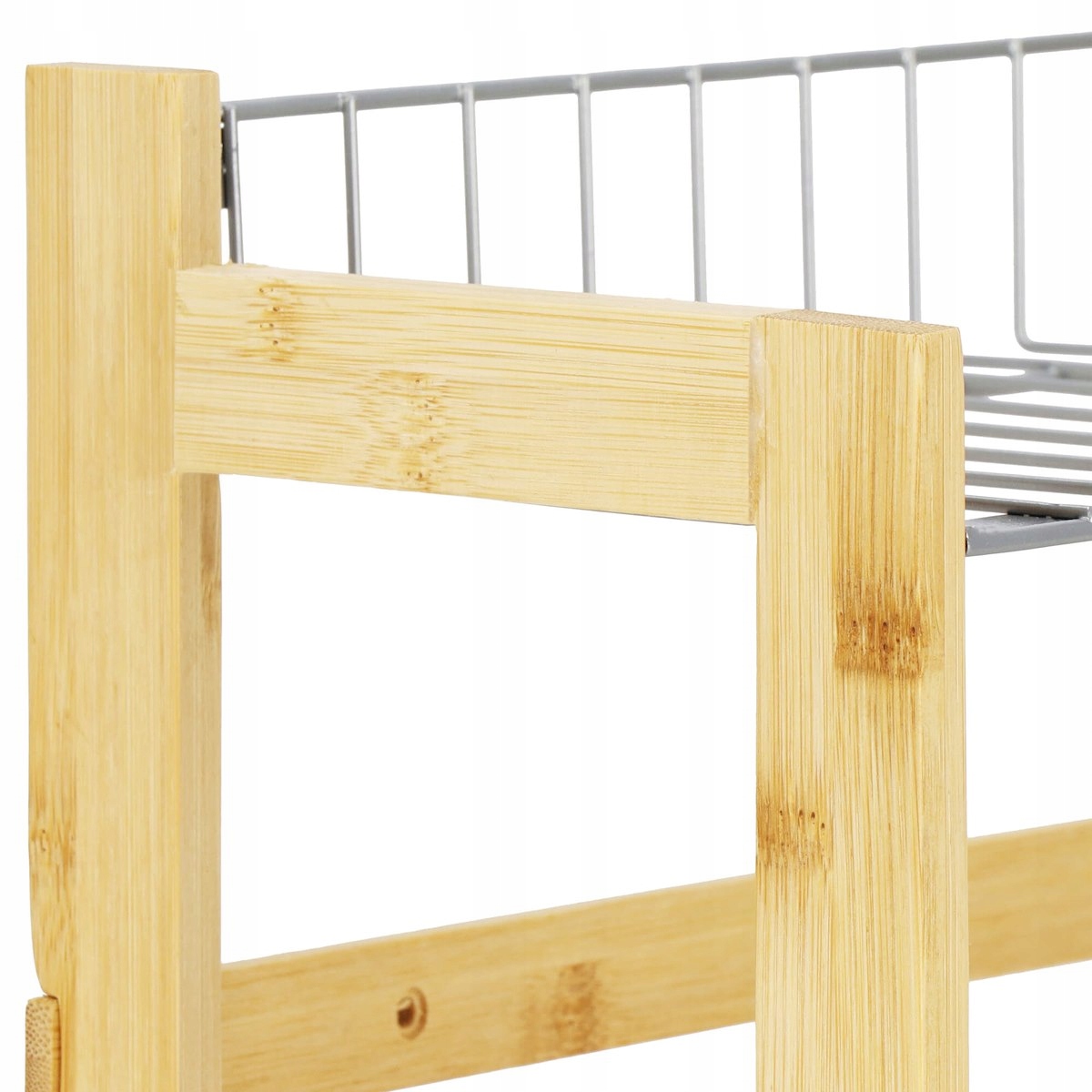 Полиця оснащена бамбуковим каркасом і металевими полицями. Міцна конструкція ідеально підходить для зберігання баночок для спецій, невеликих кухонних аксесуарів або може використовуватися у ванній.