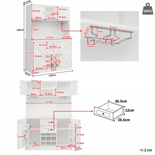 Ця кухонна тумба має розміри 120 x 40 x 188 см і забезпечує надійне навантаження 60 кг. Його щедрий, але компактний дизайн ідеально вписується в різноманітні планування кухні.