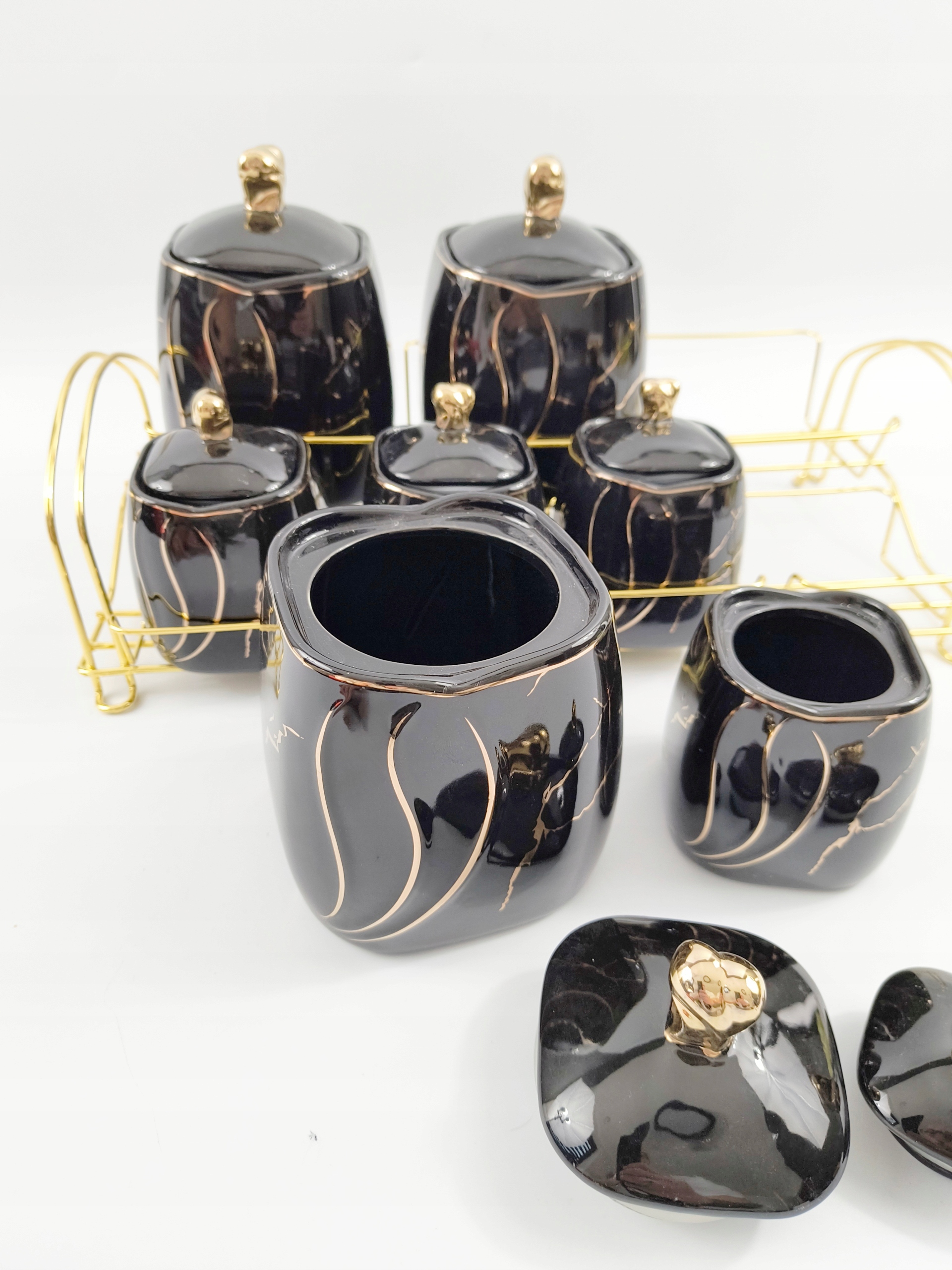Набір кухонних контейнерів 7 шт. з високоякісної порцеляни . Вони ідеально підходять для зберігання кави, цукру тощо. Завдяки щільному закриванню ваша кава збереже свій аромат і смак. Кожен контейнер чудово прикрашений ЧОРНИМ МАРМУРНИМ МОТИВОМ З ДОДАТКОВИМ ДЕКОРАЦІЄЮ. По периметру кожного контейнера є декоративні золоті смуги, що надає набору унікальний та елегантний характер.