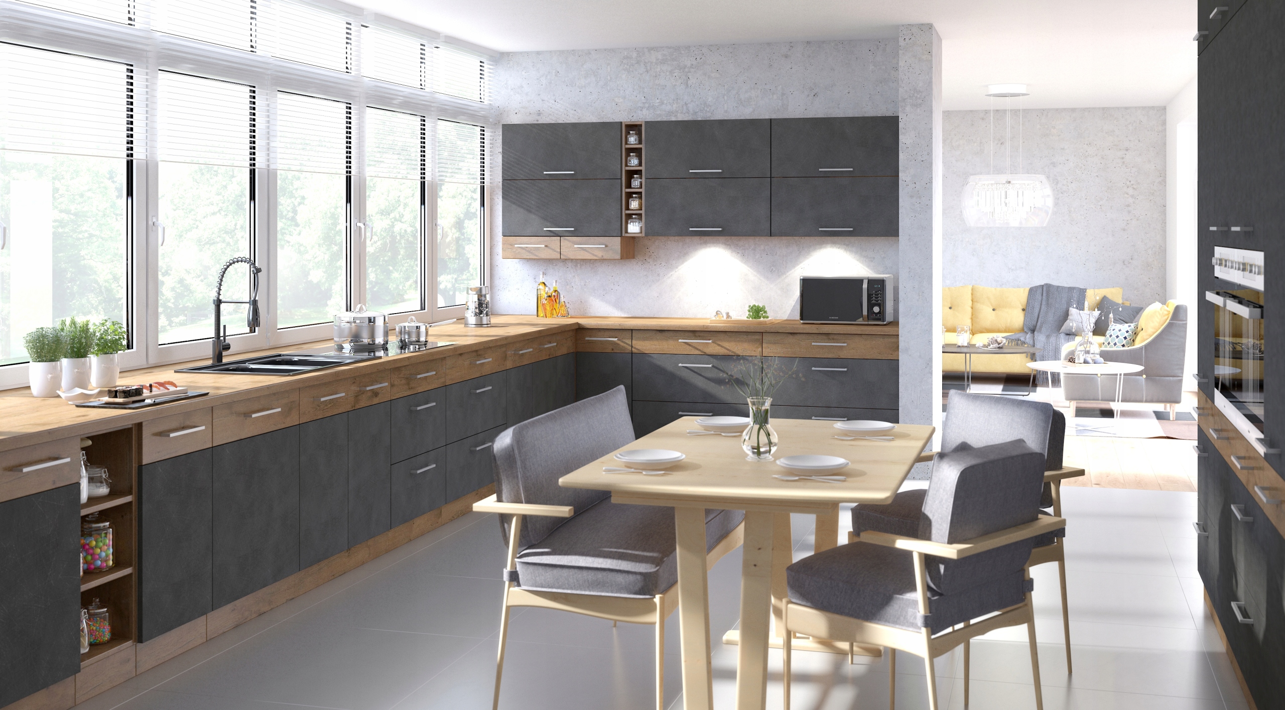 Кухонні меблі IVO — це асортимент, який вражає не лише своїм дизайном, а й своєю практичність і функціональність. Фасади виготовлені з білої глянцевої дошки зі вставками під дерево. Корпус шафи кольору дуб ланцет красиво поєднується з елементами представлених меблів. 44 елементи на вибір (зокрема, нижні шафи з ящиками, кутові шафи, підвісні шафи, окремо стоячі шафи для вбудованої духовки чи посудомийної машини) задовольнять будь-якого вимогливого користувача.