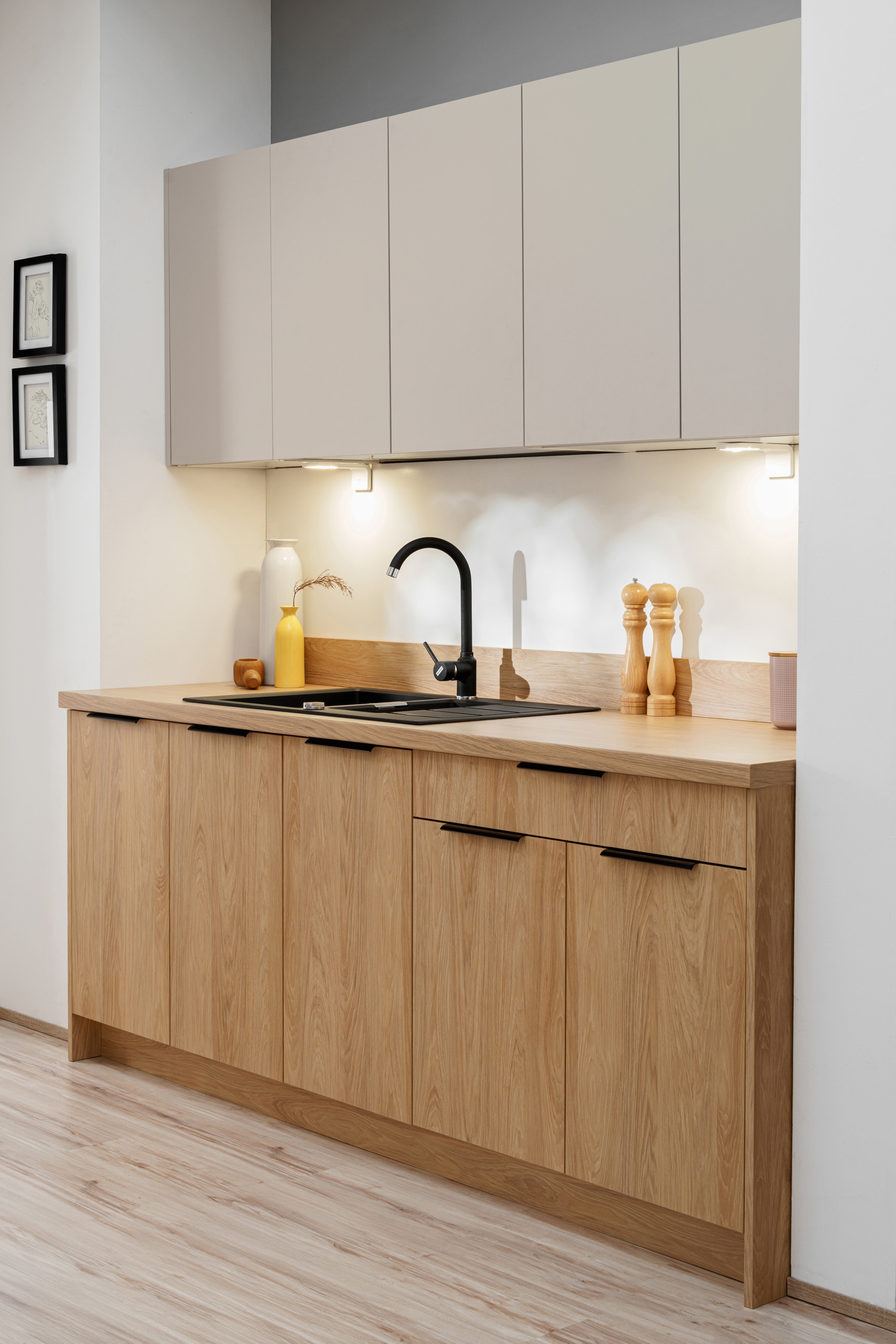 ✅ Фронти: 18 мм ламінована пластина у килимі Кашмірі у верхніх шафах та дубі Хікори в нижніх шафах