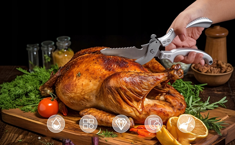- Багатофункціональне різання: призначені для м'яса, птиці (курка/качки тощо) та риба, легка різання кістки, фасції та плавники, замінюючи нудну роботу традиційних ножів. Завдання, такі як розбиття всіх курей, переробка риби, обрізання стейків тощо.