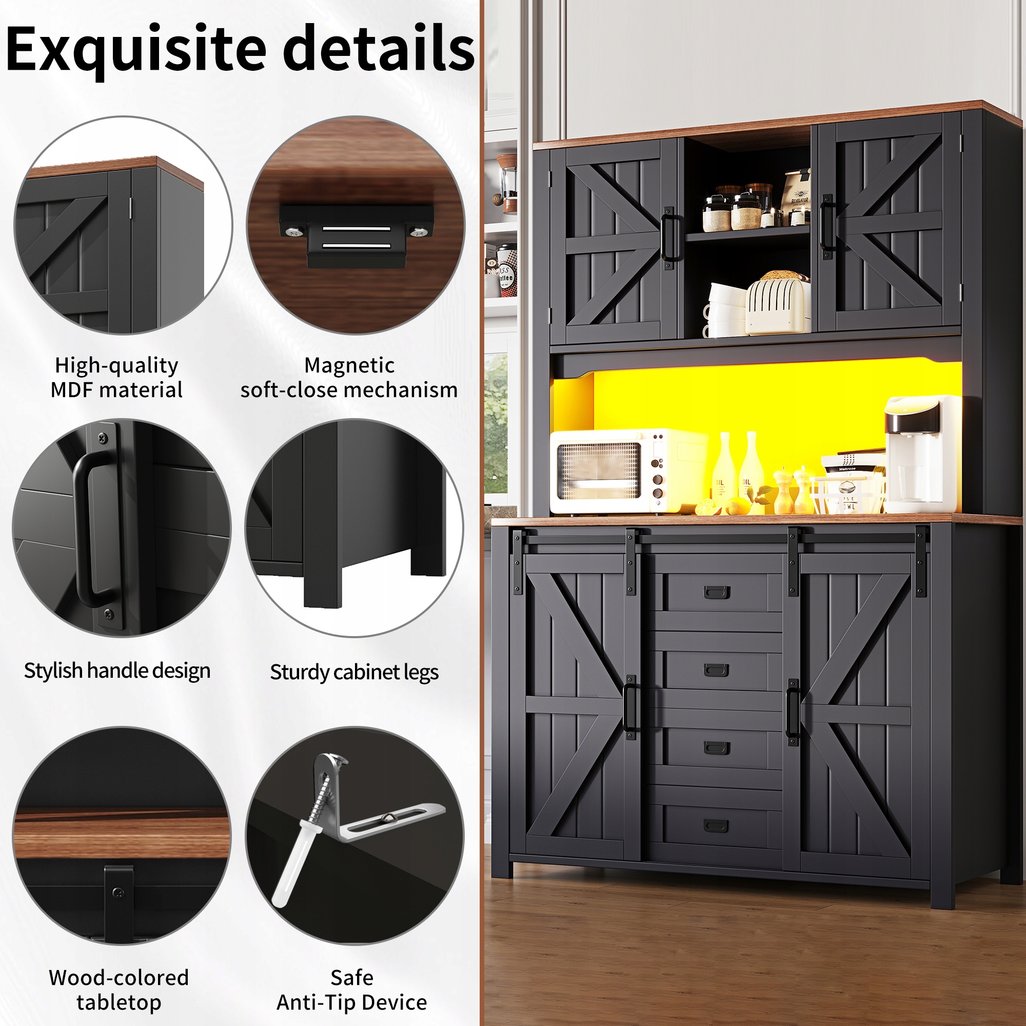 - Має кілька відділень, у тому числі окрему верхню шафу з магнітними дверцятами та регульовані полиці для різних потреб. Відкрита центральна секція ідеально підходить для демонстрації кавових машин, ваз або фужерів, забезпечуючи легкий доступ до них. База включає закриті шафи та ящики з регульованими полицями відповідно до ваших потреб.