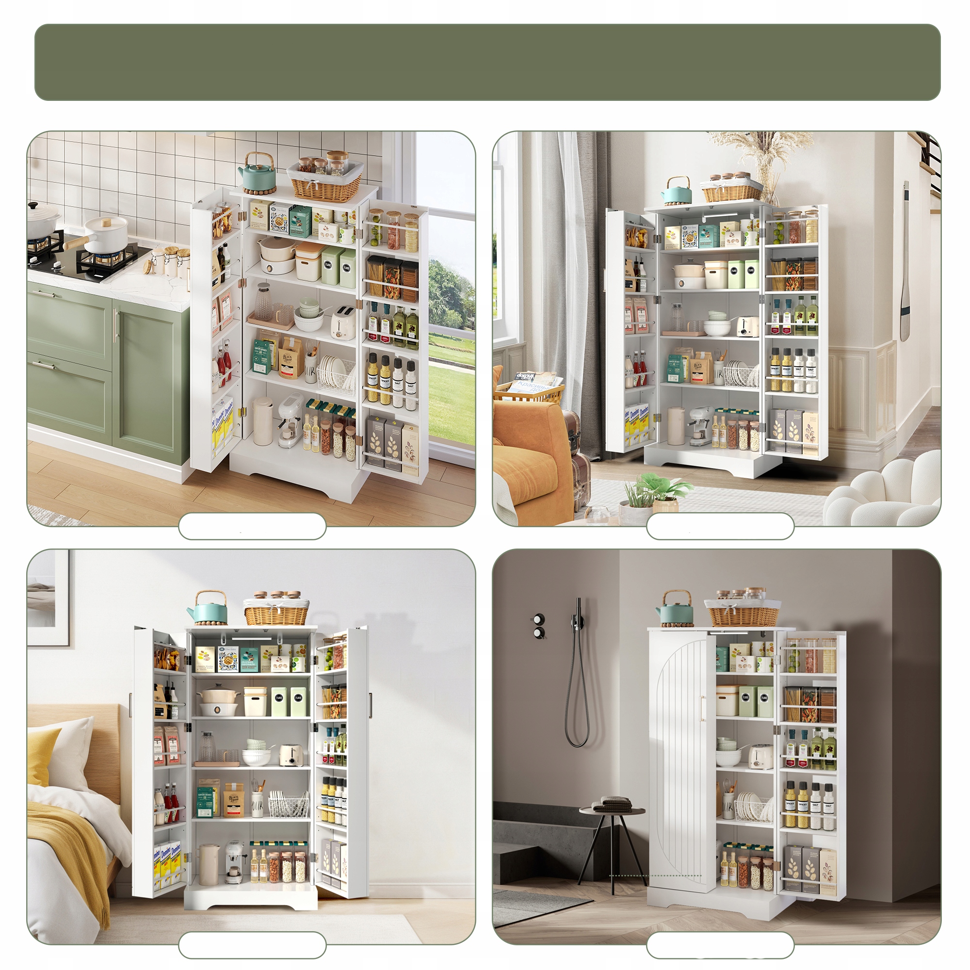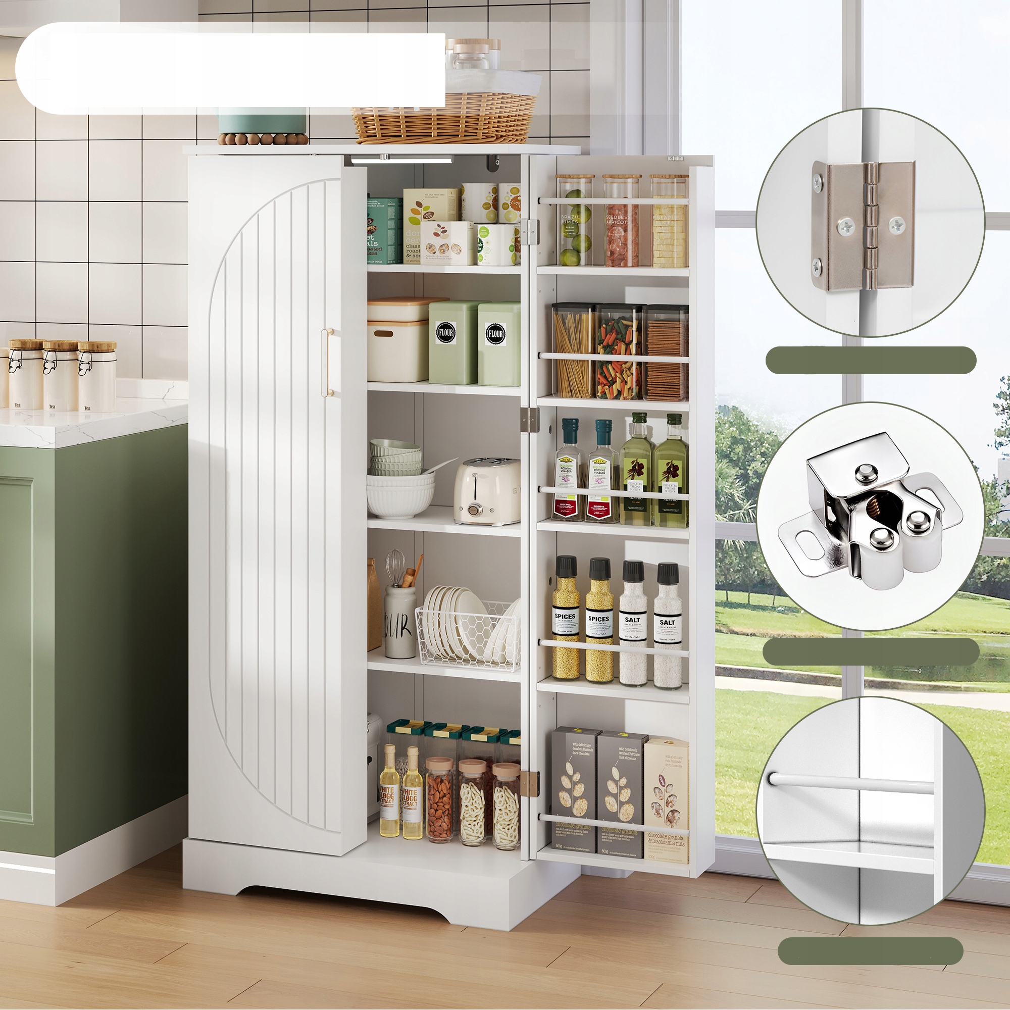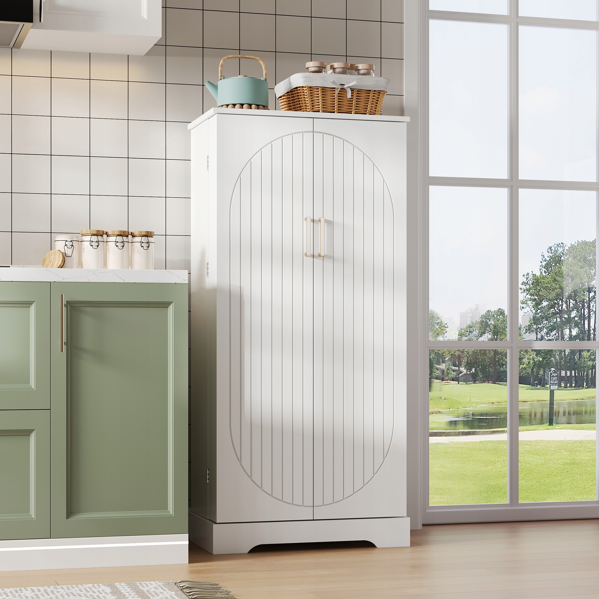🌈[Елегантний і універсальний дизайн] Ця окремо стояча кухонна шафа виготовлена з деревини високої щільності, яка є водонепроникною, довговічною та легко чиститься. Біла обробка та декоративні арки на дверцятах чудово пасують до сучасних, скандинавських чи класичних кухонь, а також підійдуть у вітальнях, коридорах чи коморах.