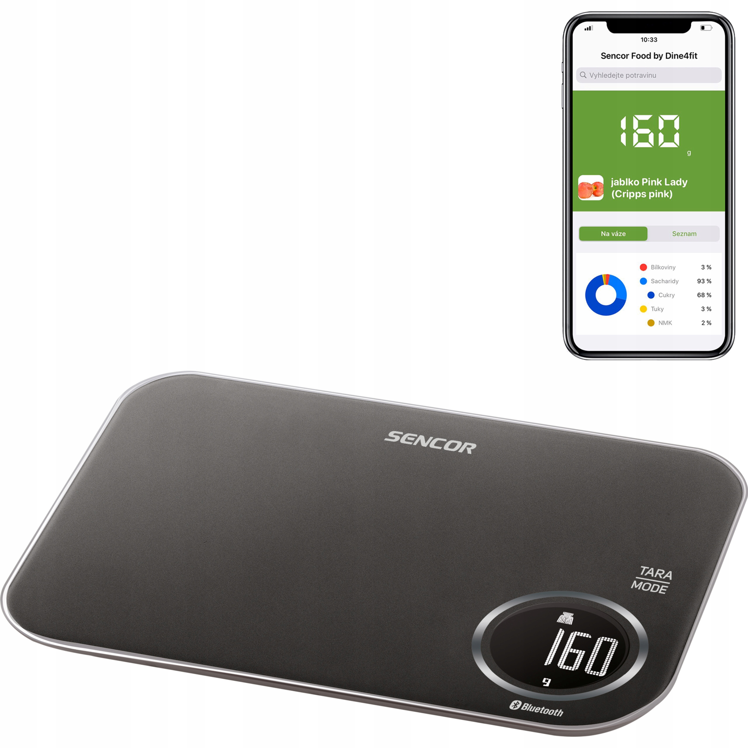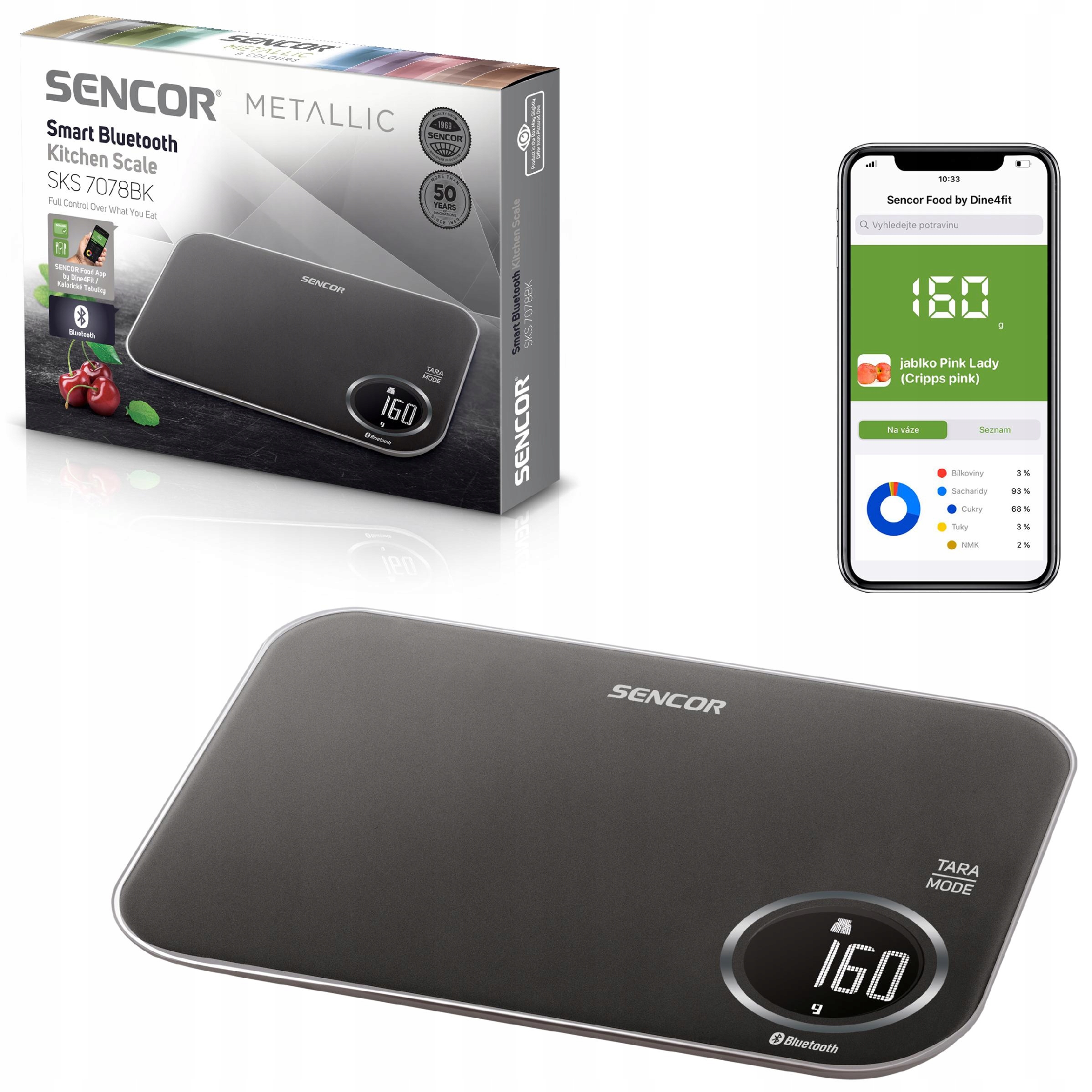 Електронні ваги Sencor SKS 7078BK – це вимірювальний пристрій, який використовується для точного визначення ваги різних типів об’єктів. Ці ваги оснащені великим РК-дисплеєм, який відображає результати вимірювань у грамах, унціях або фунтах, залежно від уподобань користувача. Ваги підключені до телефонної програми. Додаток показує, скільки вуглеводів, жирів і цукру містить зважений продукт, а також багато інших параметрів.