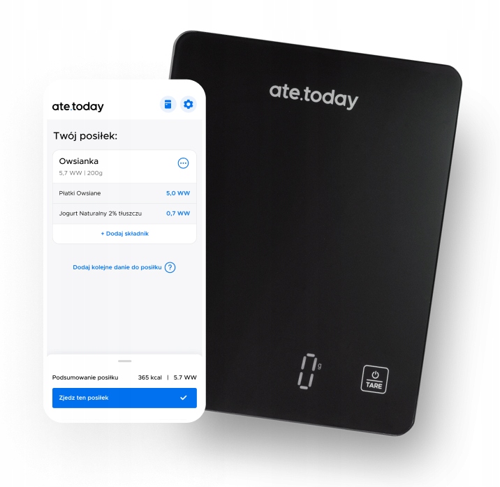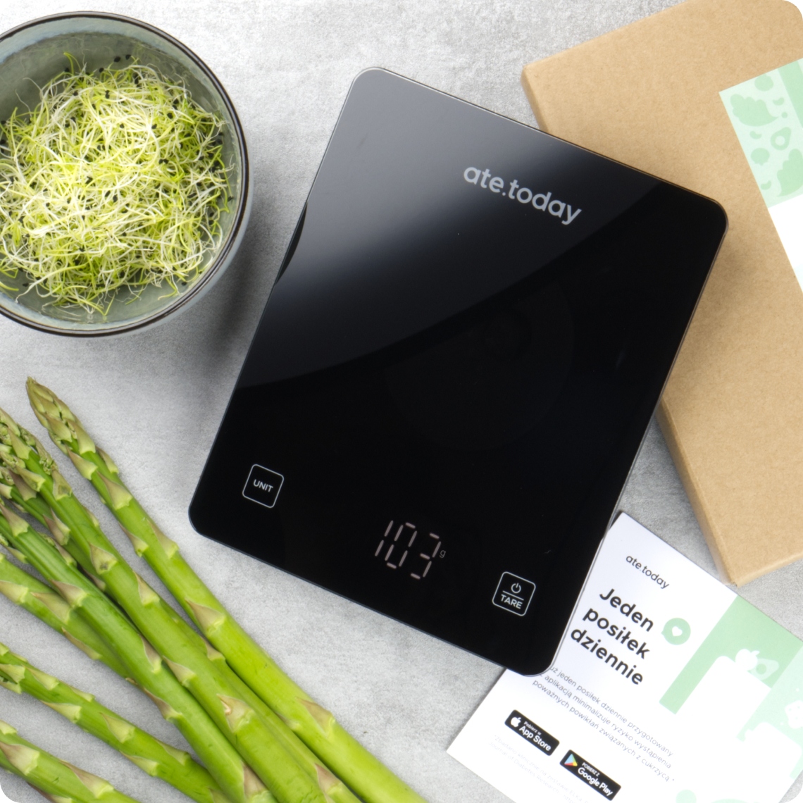 Наші Bluetooth ваги та програма ate.today є інноваційним рішенням, створеним для людей з типом 1 цукровий діабет Це дозволяє уважно стежити за своїм харчуванням, щоб досягти більш стабільного рівня цукру в крові.