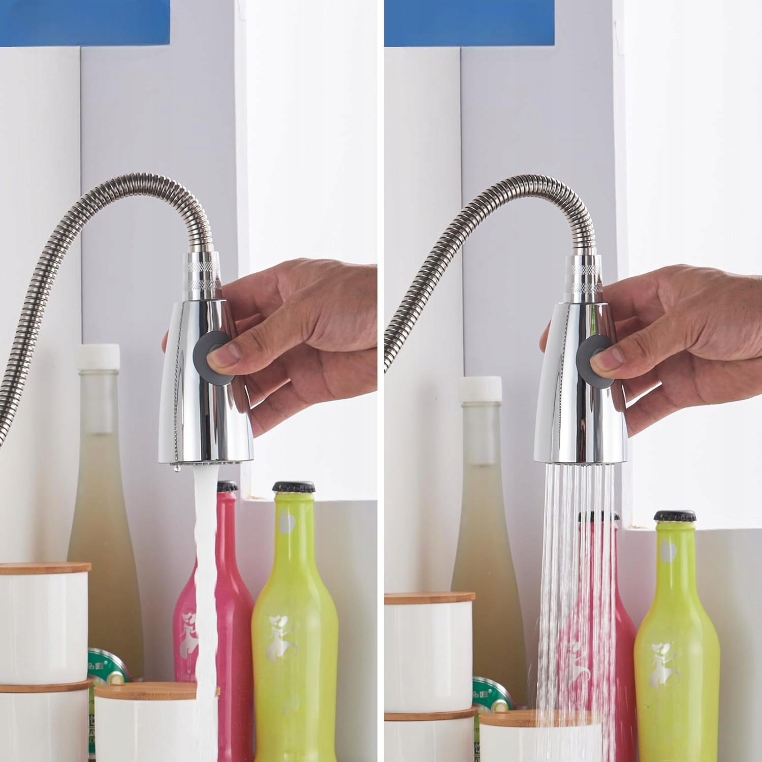 - Кухонний акумулятор з 2 типами водного потоку - цей кухонний акумулятор з душем з витяжкою оснащений 2 потоками води, включаючи потокове та розпилення. Водний потік має структуру високого тиску і забезпечує сильний потік спрею для важкої роботи, пов’язаної з миттям посуду, а також простими завданнями очищення.