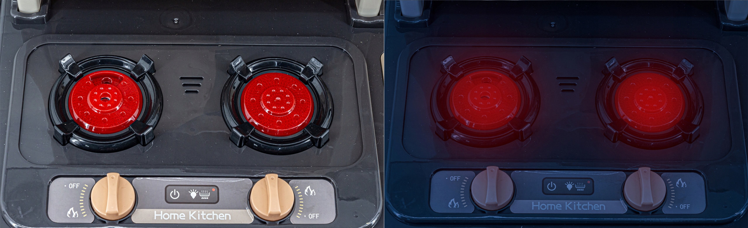 Піч має два пальники. Після включення першої ручки, перший пальник увімкнено, світить вогні, а пара імітує пропарюю воду з пальника.