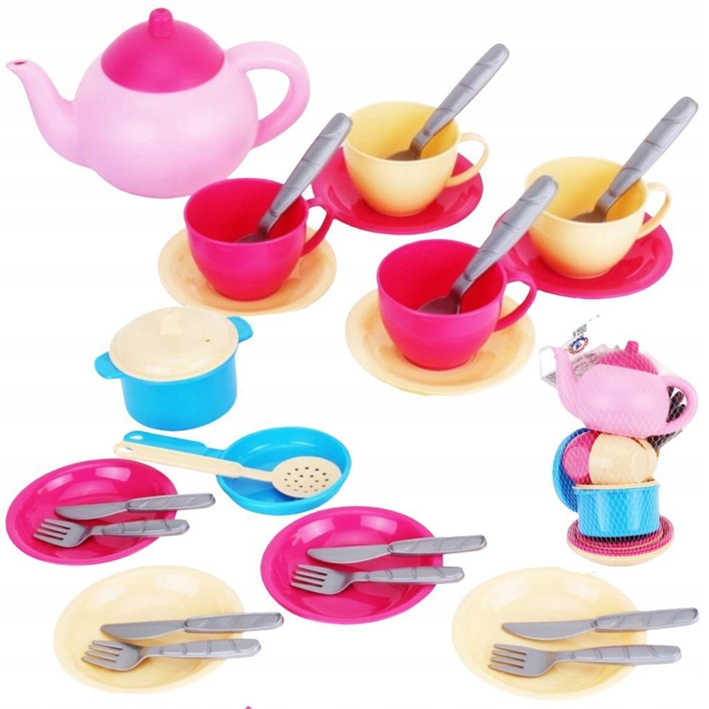 У набір входить: чайник з кришкою, 4 чашки з блюдцями, 4 тарілки, столові прибори, каструля з кришкою, сковорода, кухонний посуд.